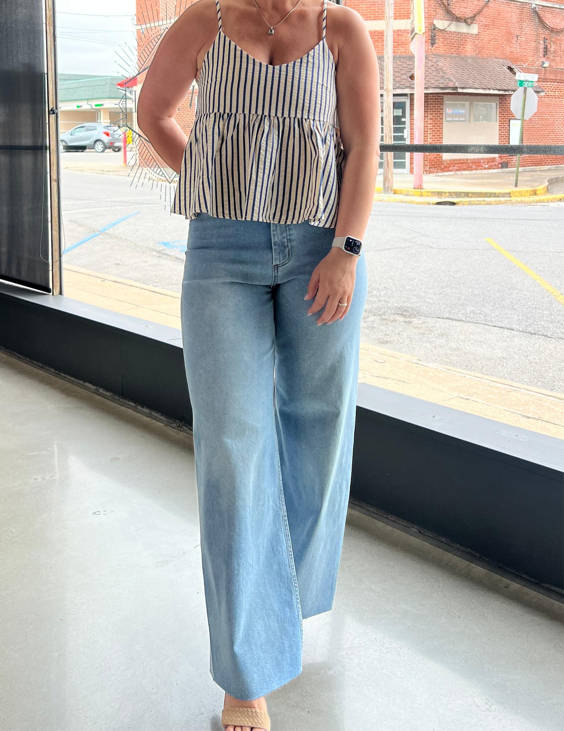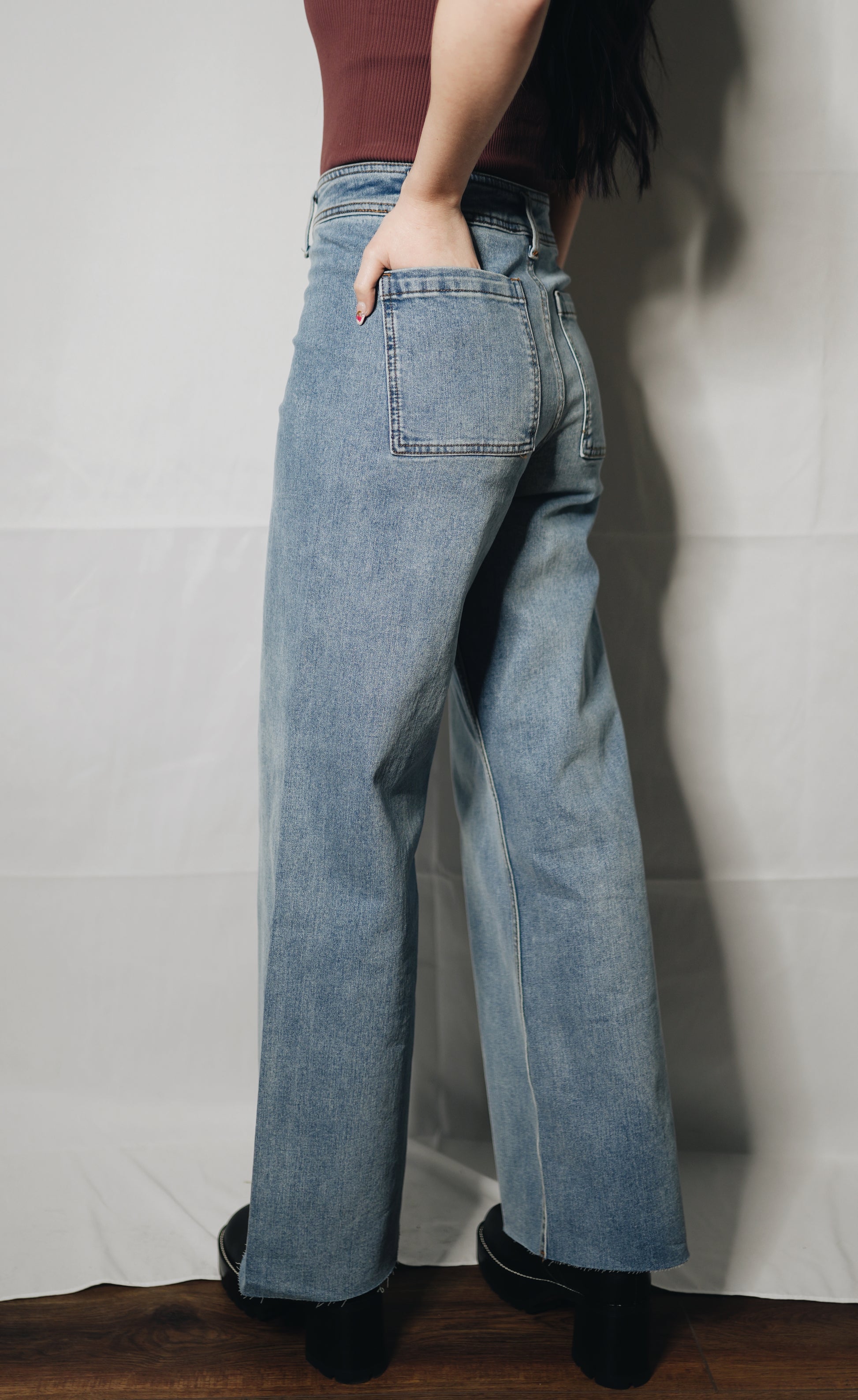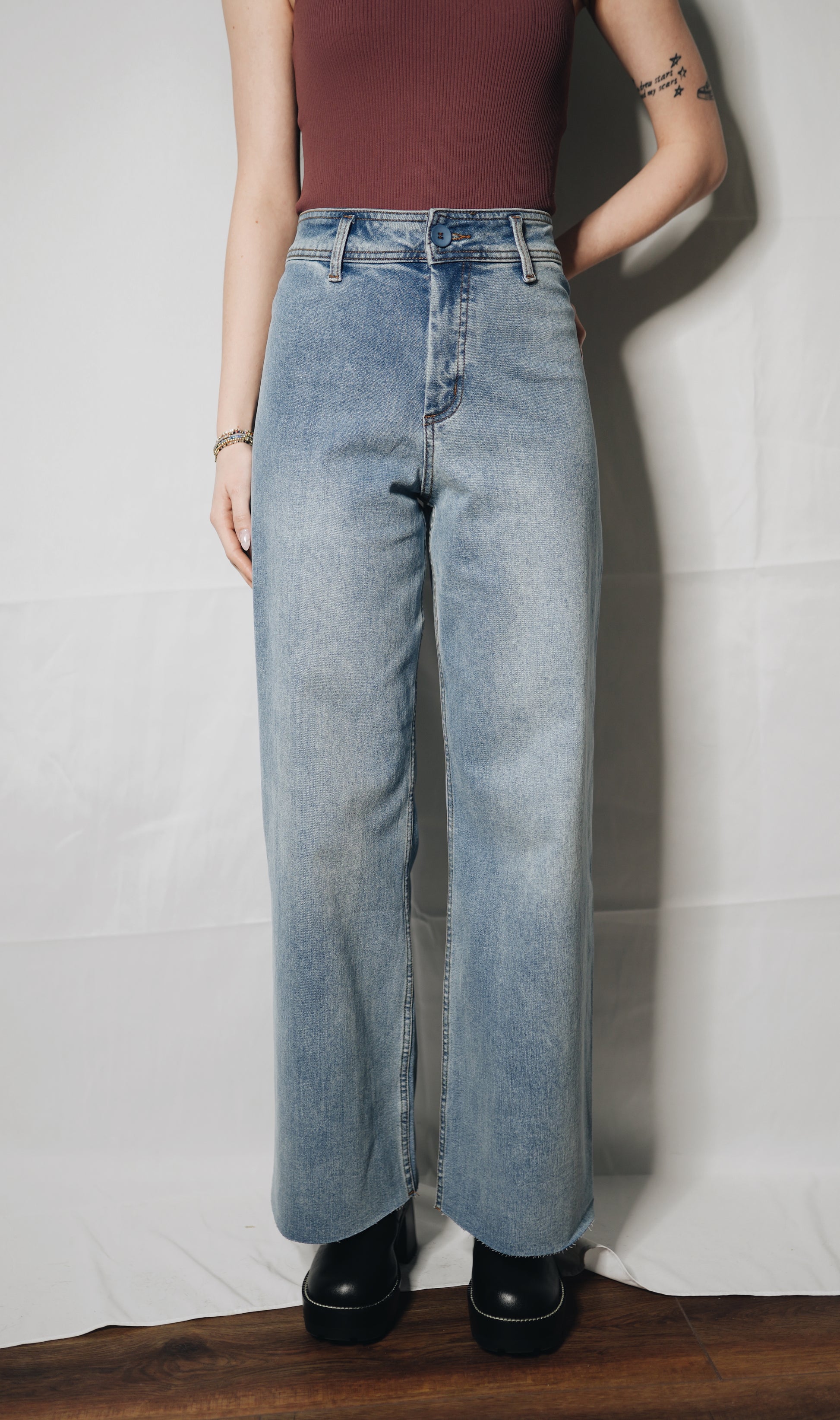 Crafted from premium materials, these straight wide leg denim pants in a light wash exude effortless elegance. The raw hem adds a touch of edgy sophistication to this luxurious piece.