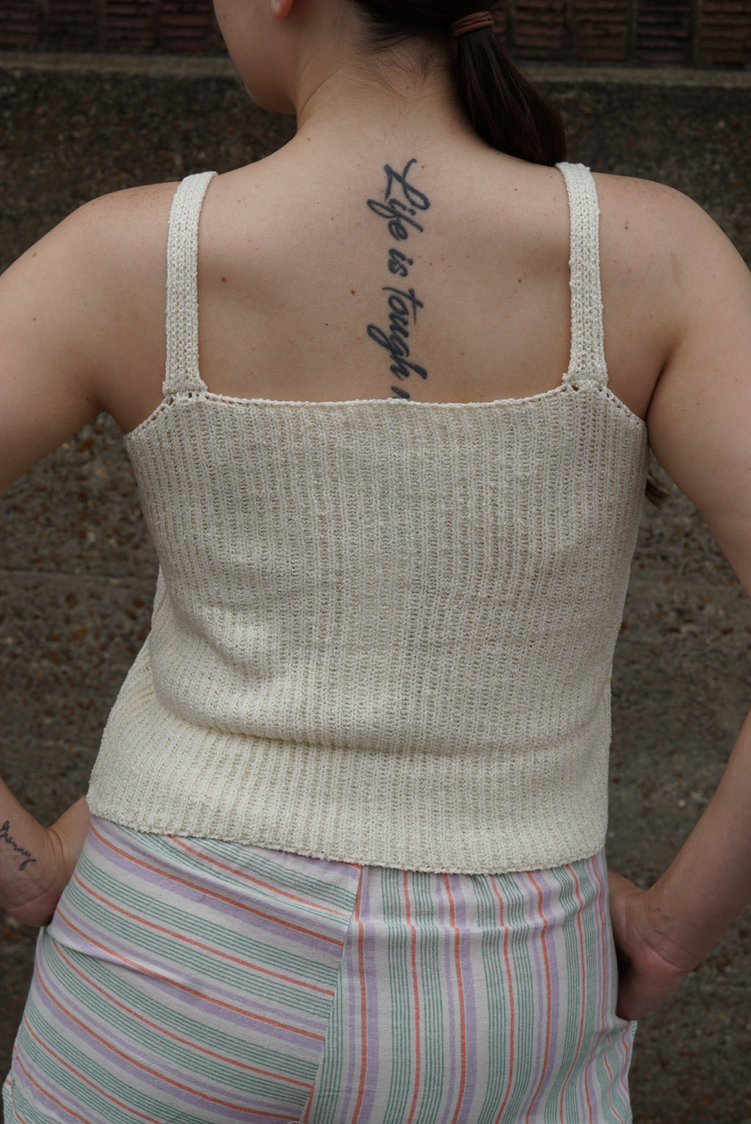 This top features a cream-colored knit tank top with a knit texture and a front button-down design.