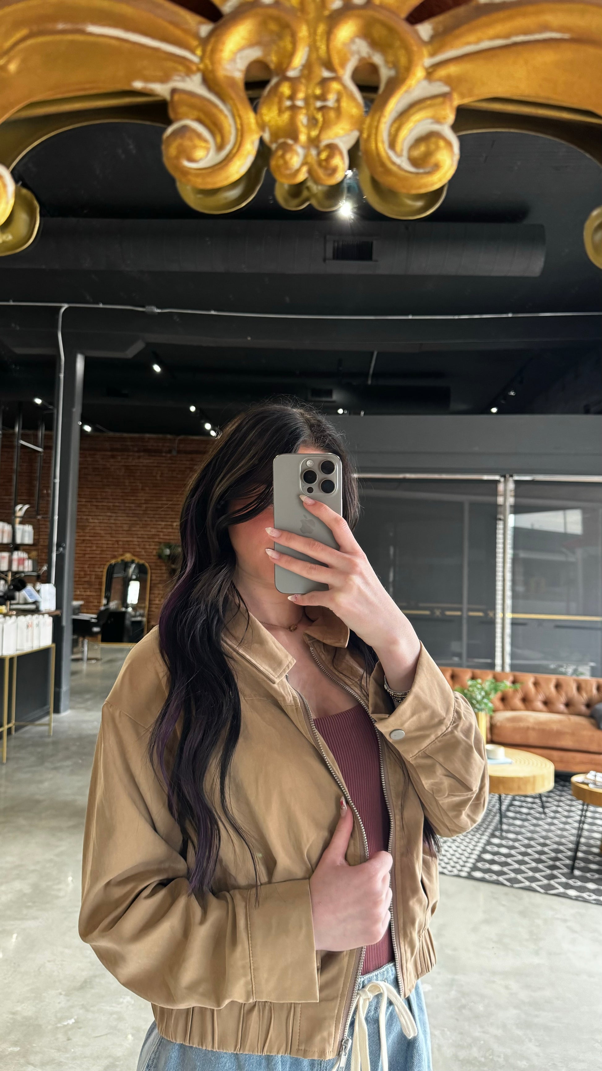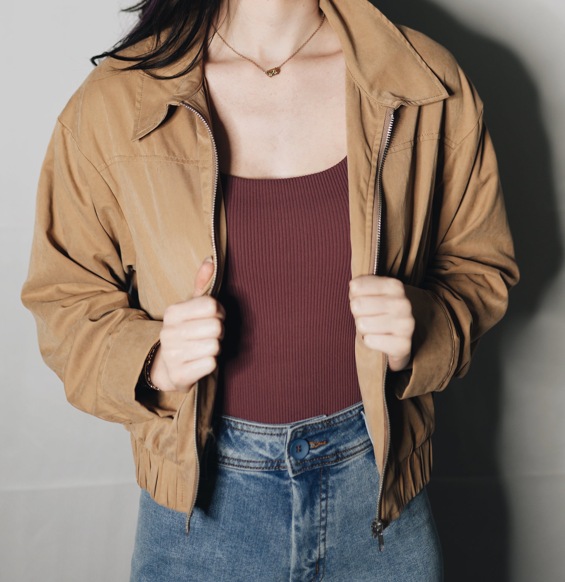 This cropped, zip up jacket has an elastic hemmed waist, and has a soft suede-like feel. Dress it up or down, this jacket is a staple piece for any wardrobe.