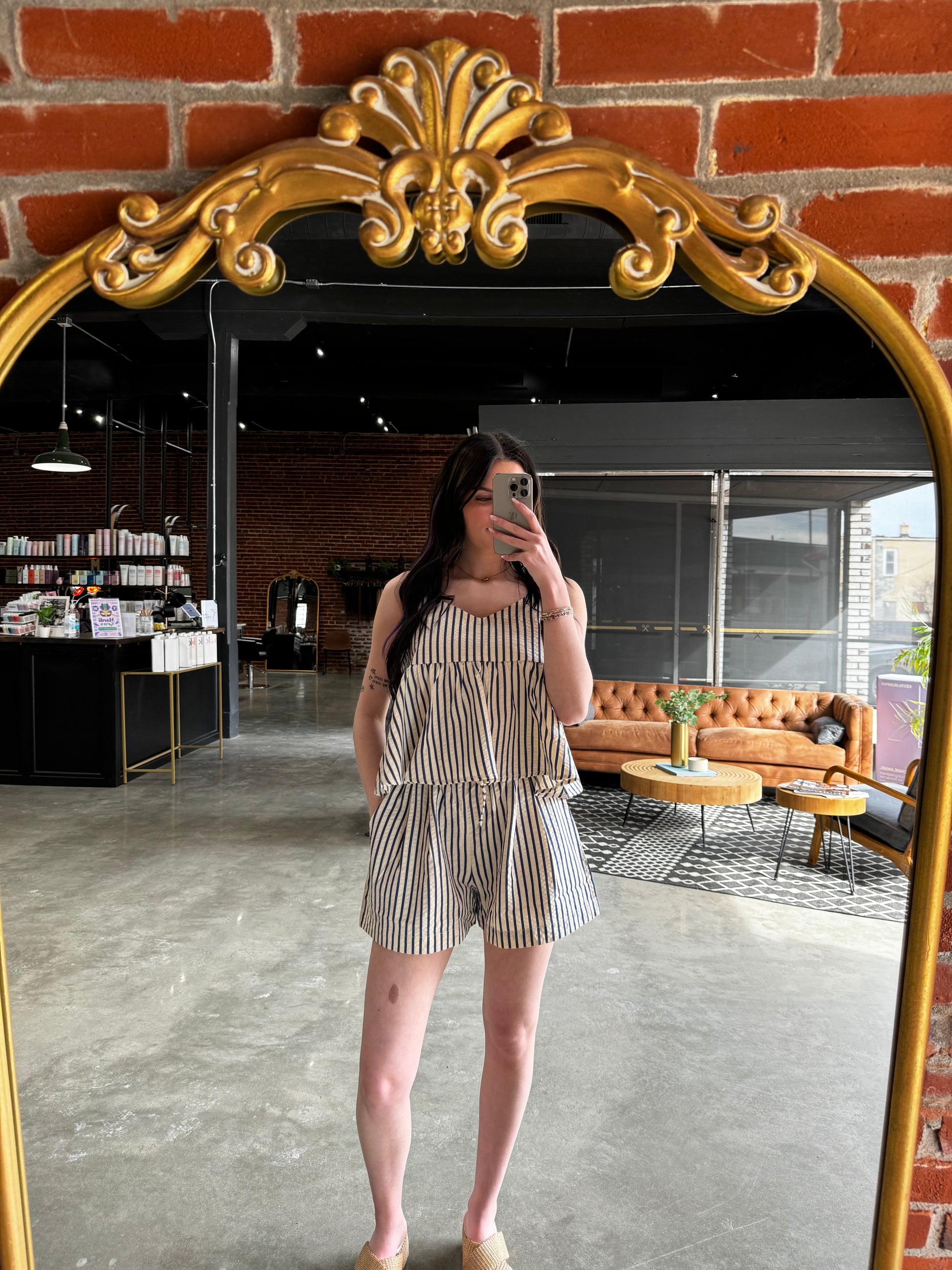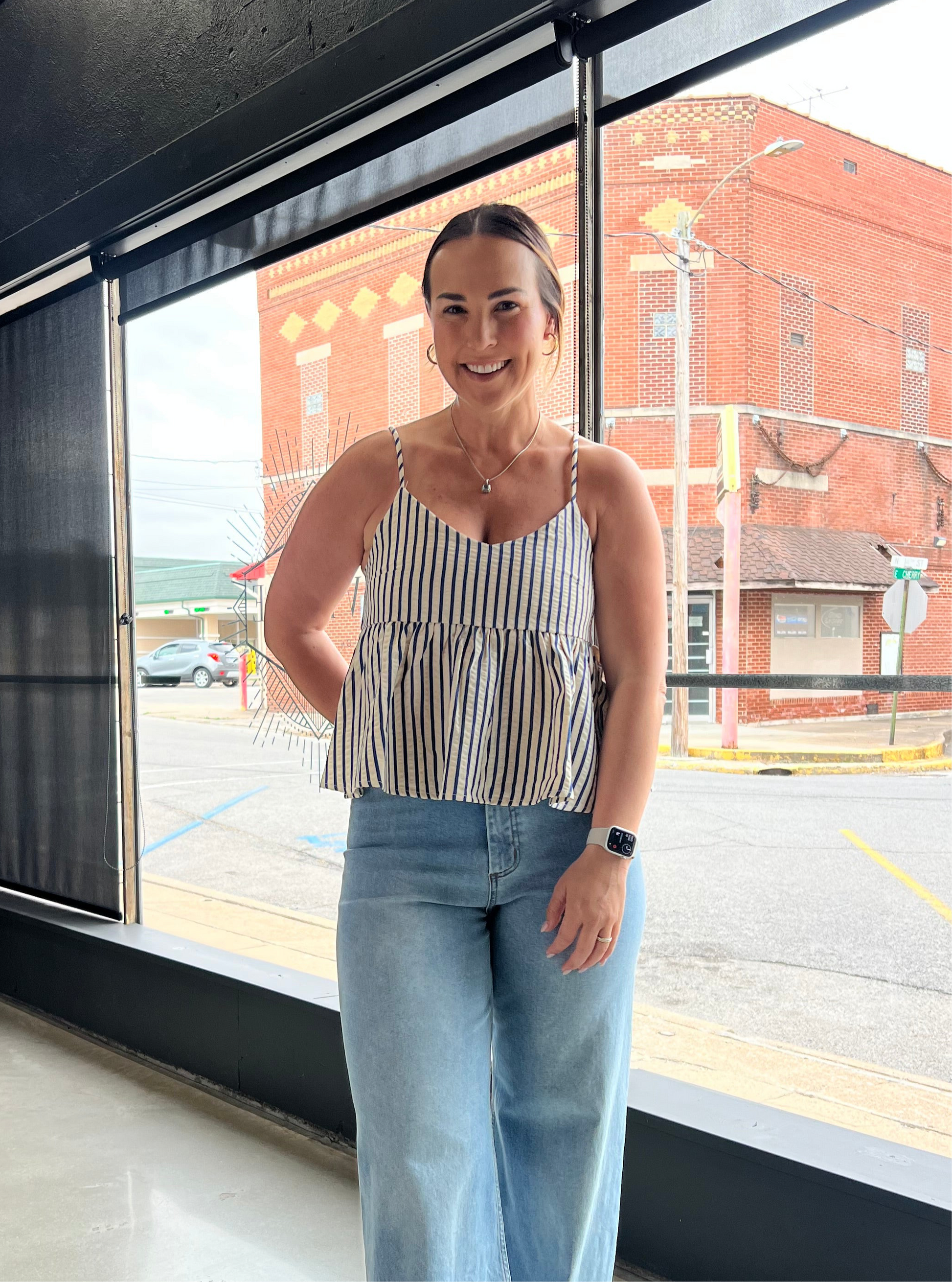 This top features a delicate adjustable spaghetti strap, a flattering babydoll silhouette, and classic striped detailing. *Complete the look with our matching shorts!