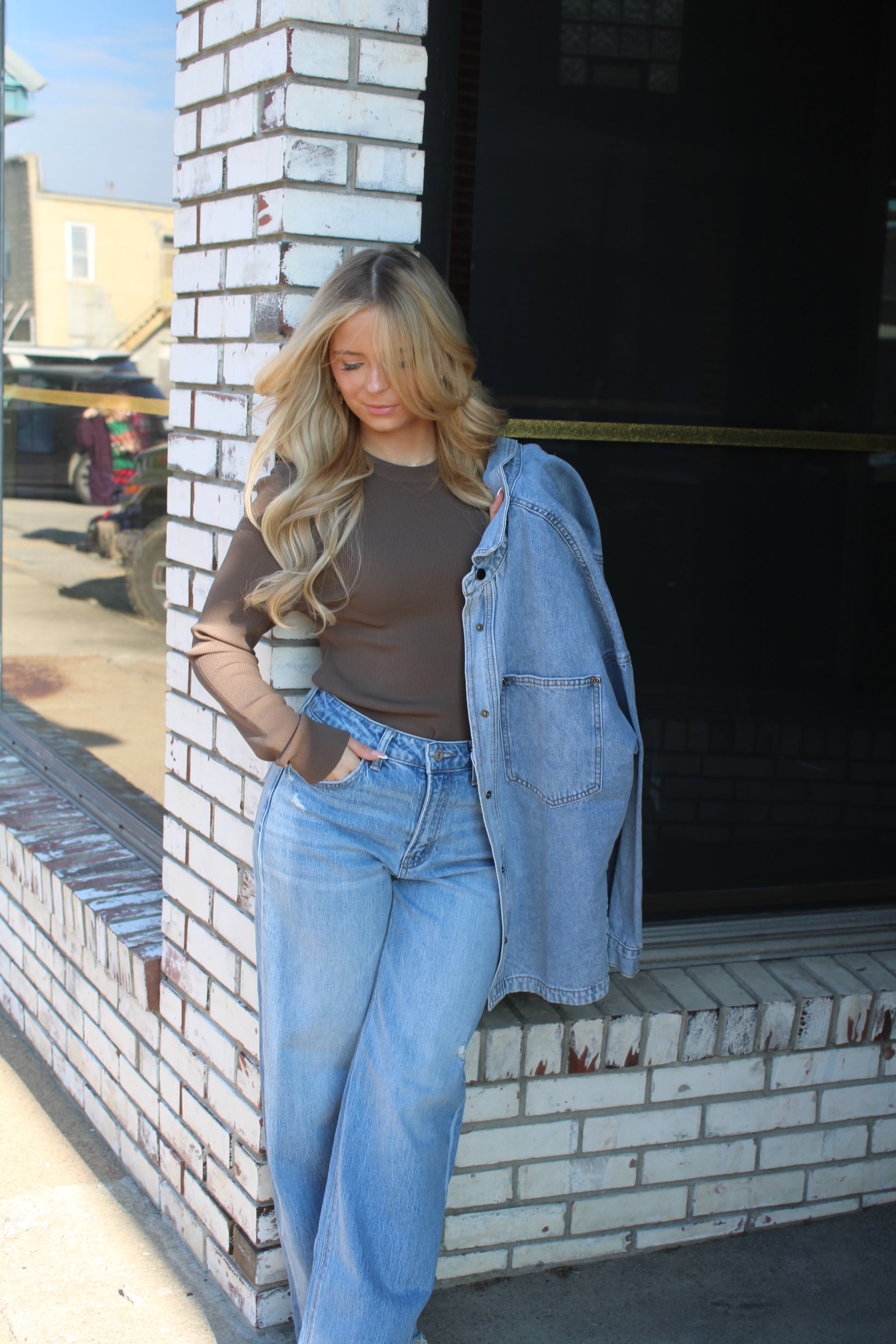 A closet essential. This coffee ribbed top layers beautifully and pairs with everything. Soft, timeless, and endlessly versatile—the staple you'll reach for all season long.