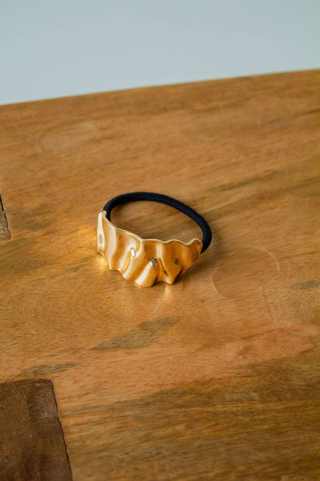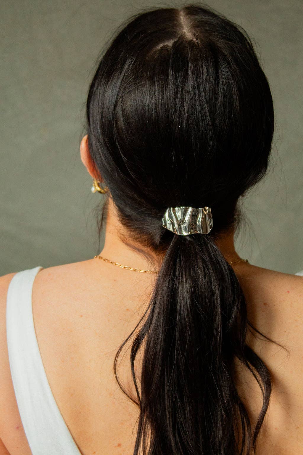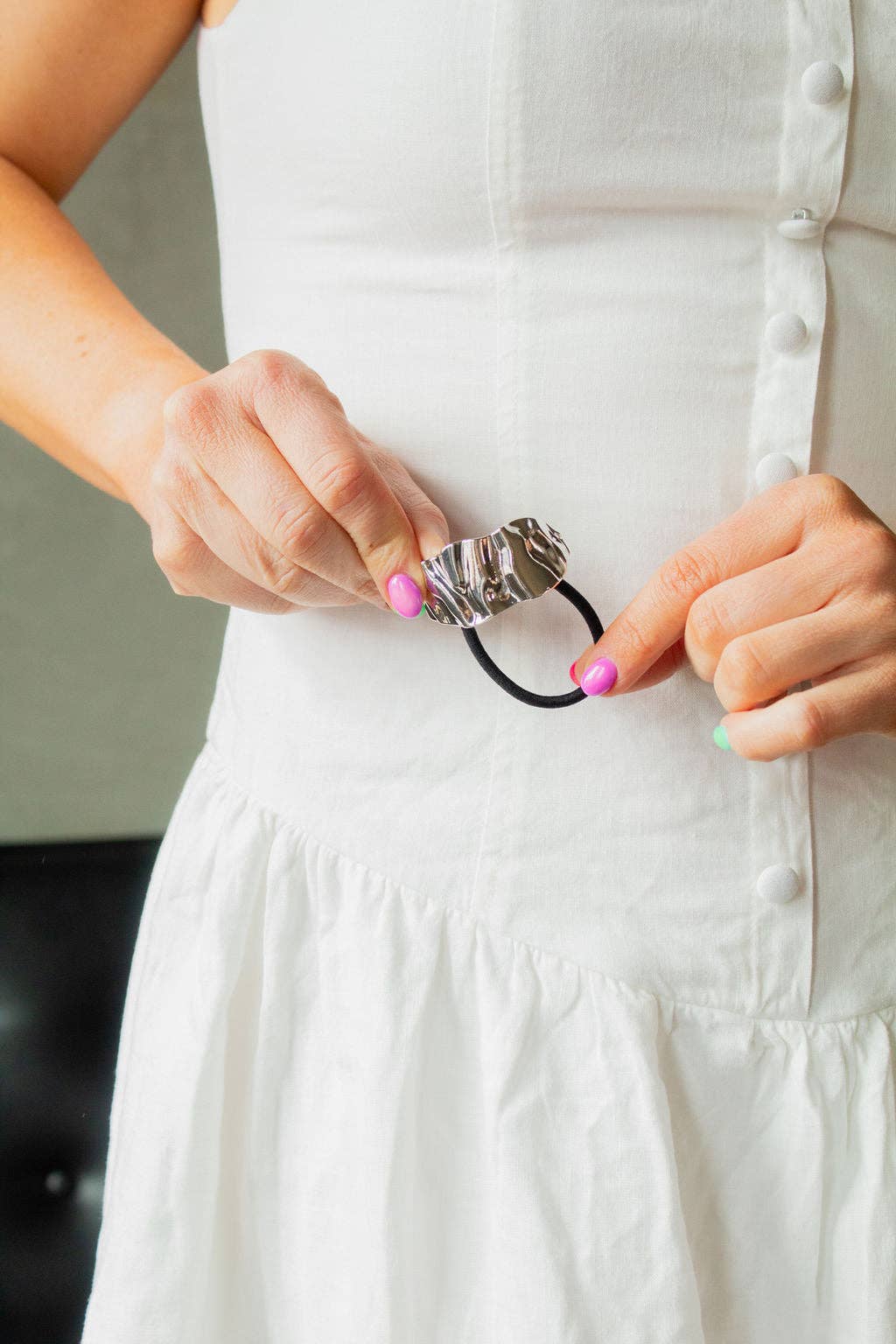 This hair tie will be the best addition to your closet! Made with a black elastic hair tie and featuring a little, crinkled metal cuff; it will hold your hair tight and give it the cutest touch while still feeling so simple.