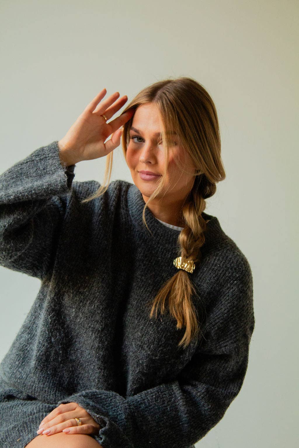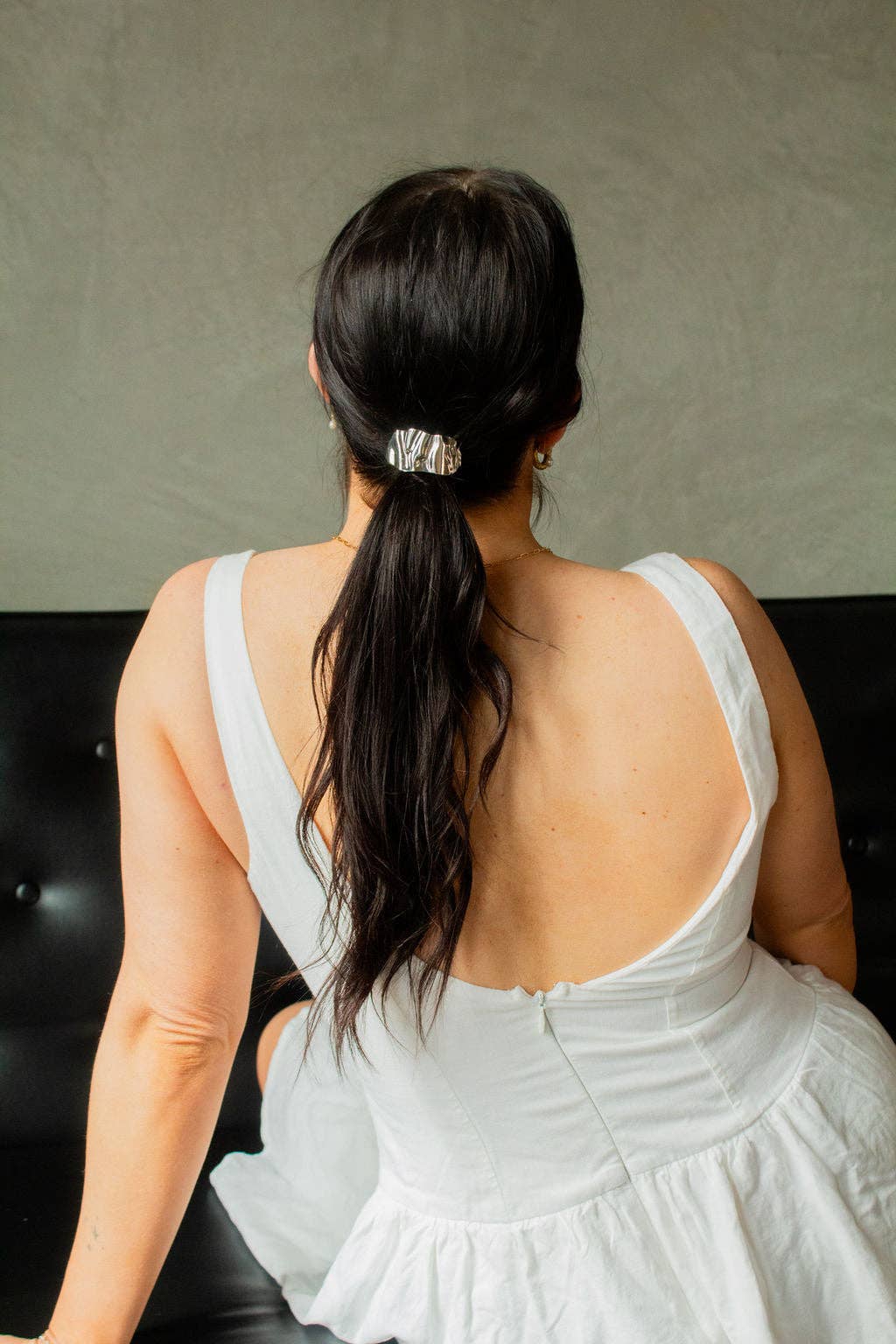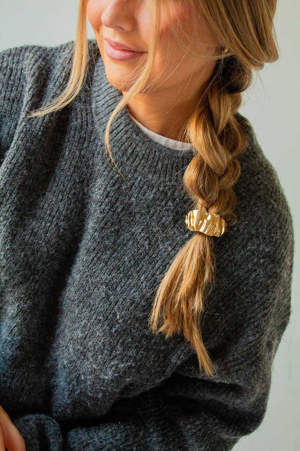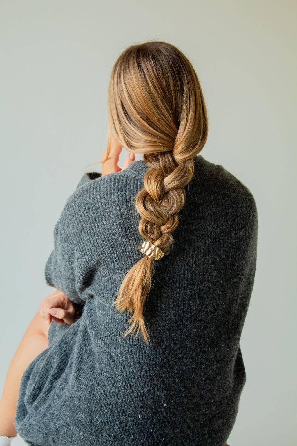 This hair tie will be the best addition to your closet! Made with a black elastic hair tie and featuring a little, crinkled metal cuff; it will hold your hair tight and give it the cutest touch while still feeling so simple.