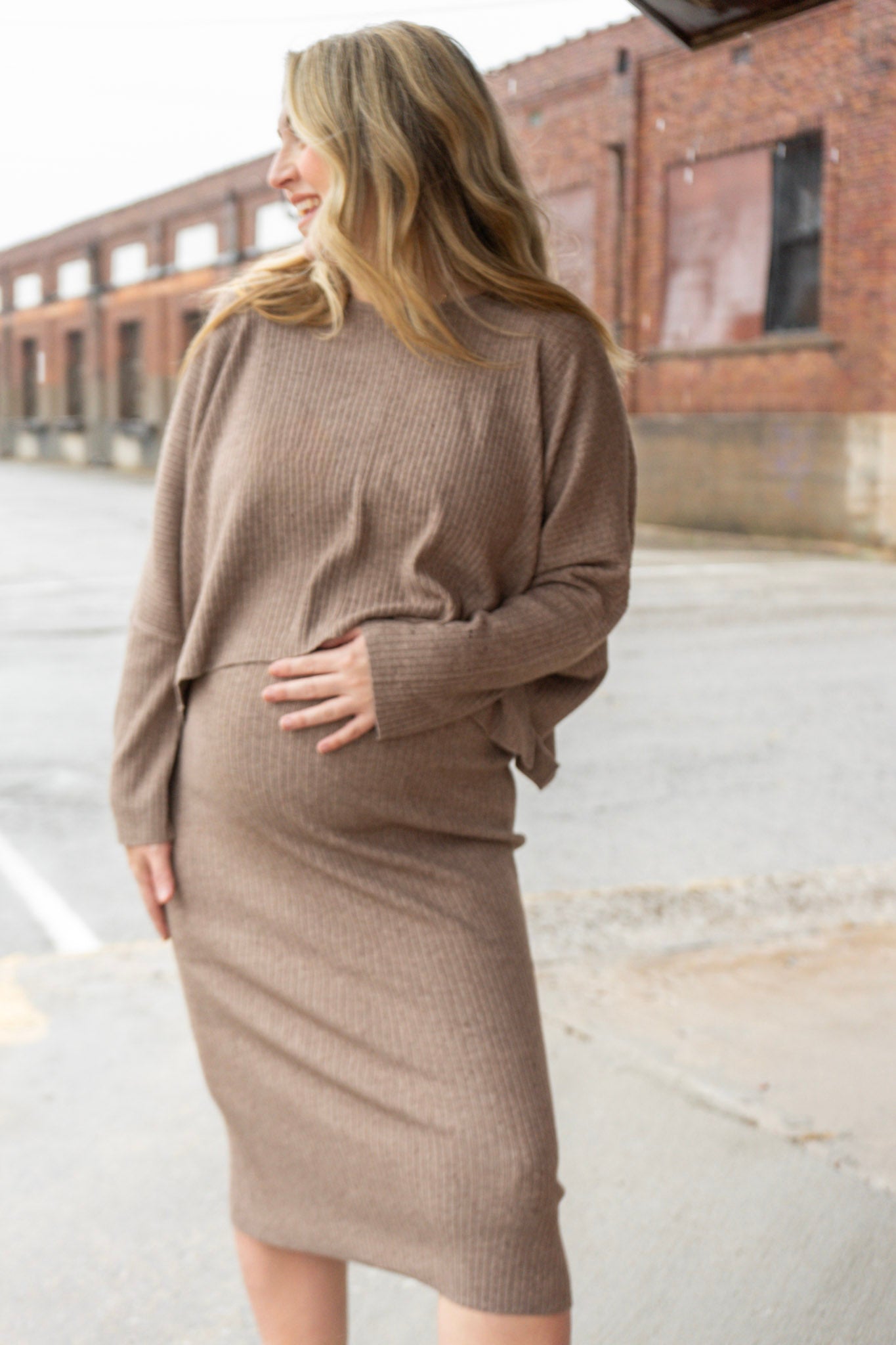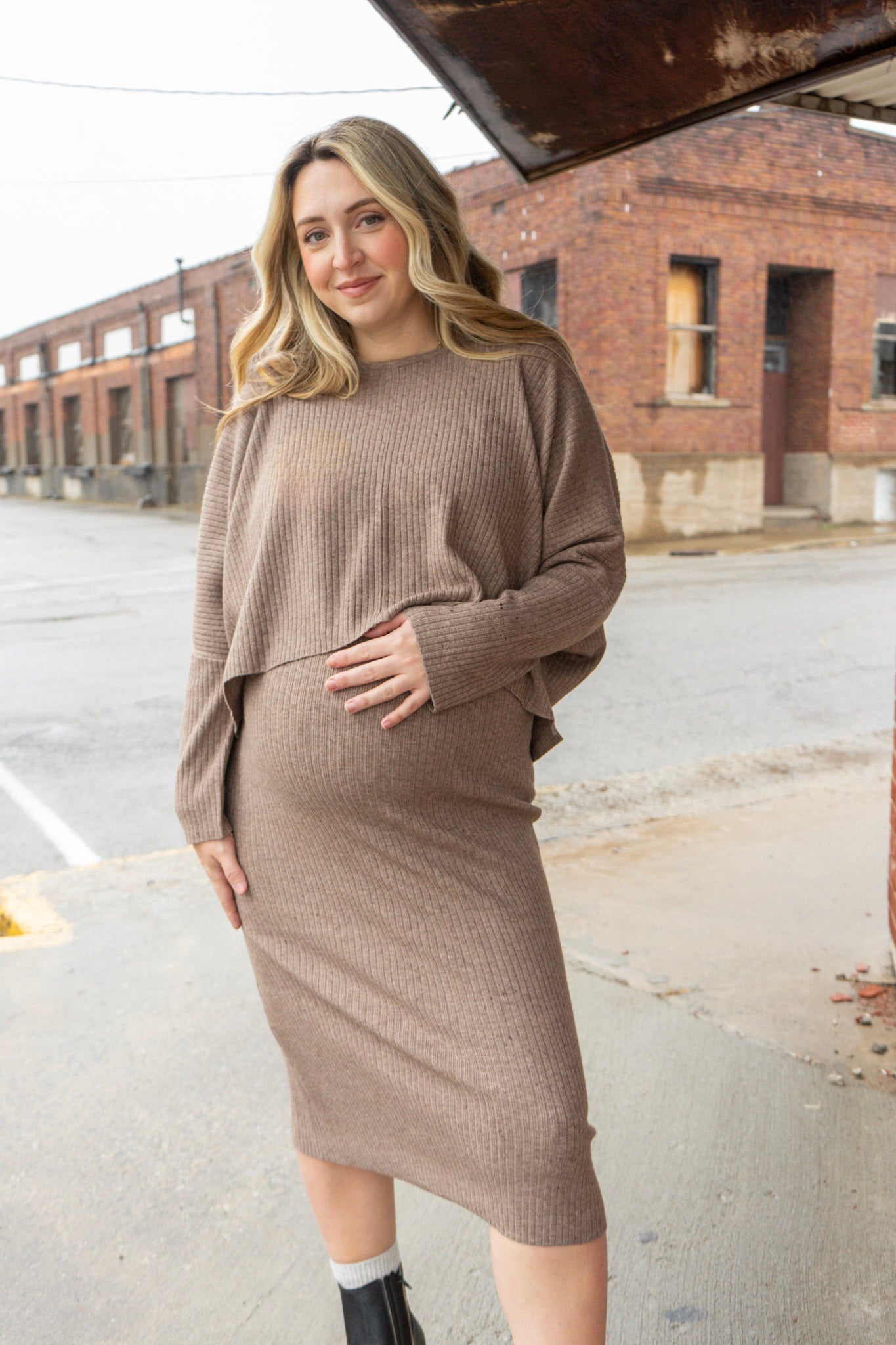 The Dark Mocha Set is your effortless layering essential—trendy, comfortable, and bump-friendly. Layer it with anything in your closet for a polished look that moves with you. Simple, cute, and made for real life.