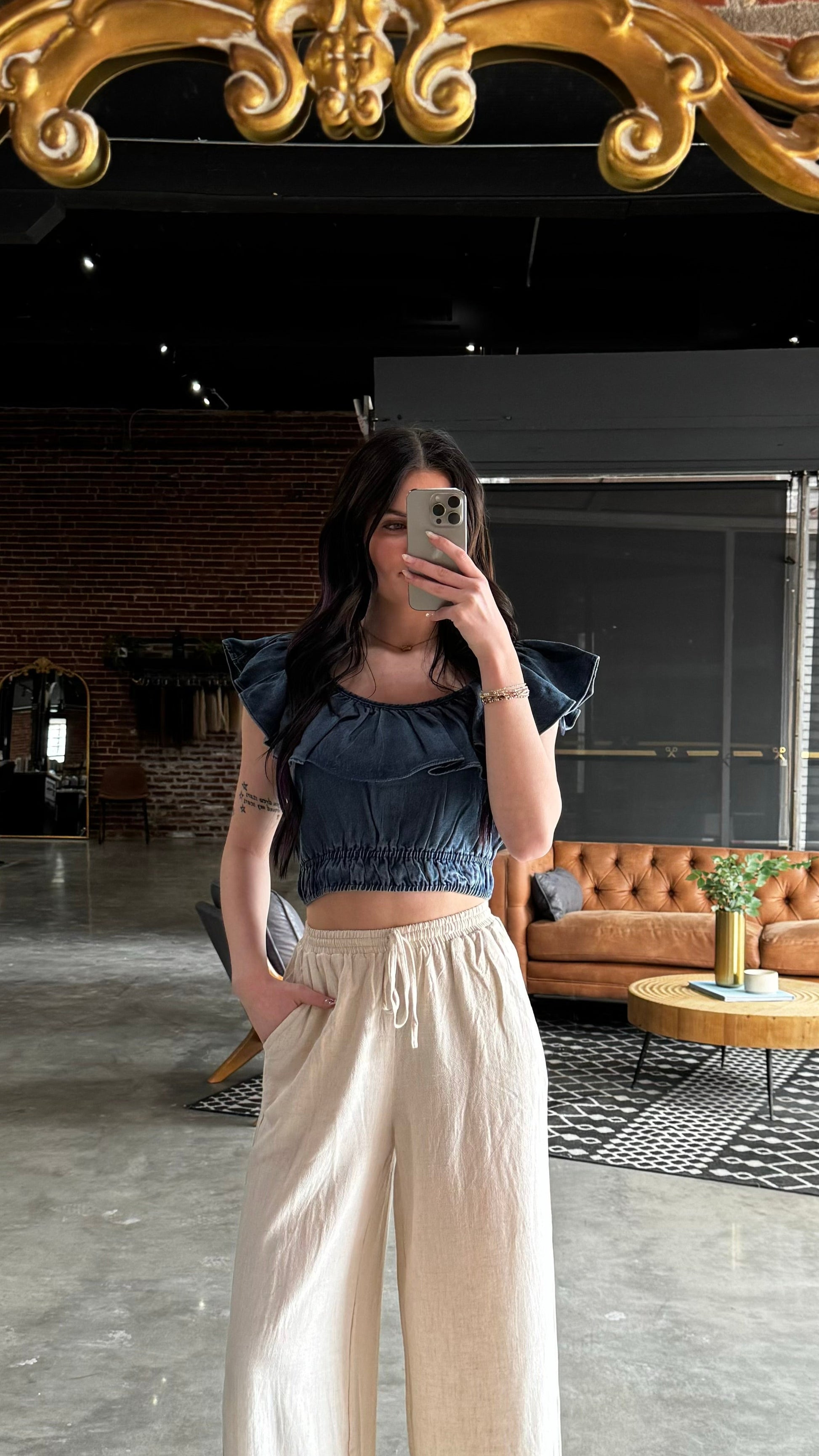 This denim shirt features a ruffled neckline that can be worn on or off the shoulder. It is a cropped style that has an elastic waistband.