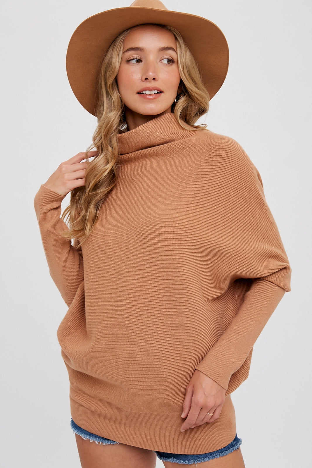 Super-soft cozy sweater featuring a volume in the body with a slouchy funnel neckline to contrast with fitted sleeves, and a relaxed silhouette. Luxuriously long in length, it drapes gracefully for a chic yet relaxed look.