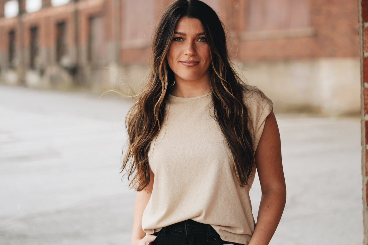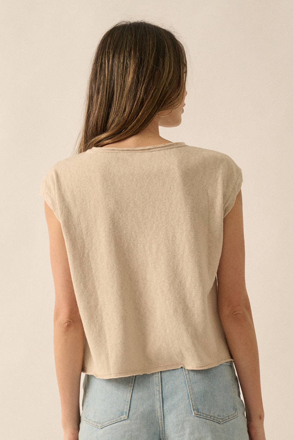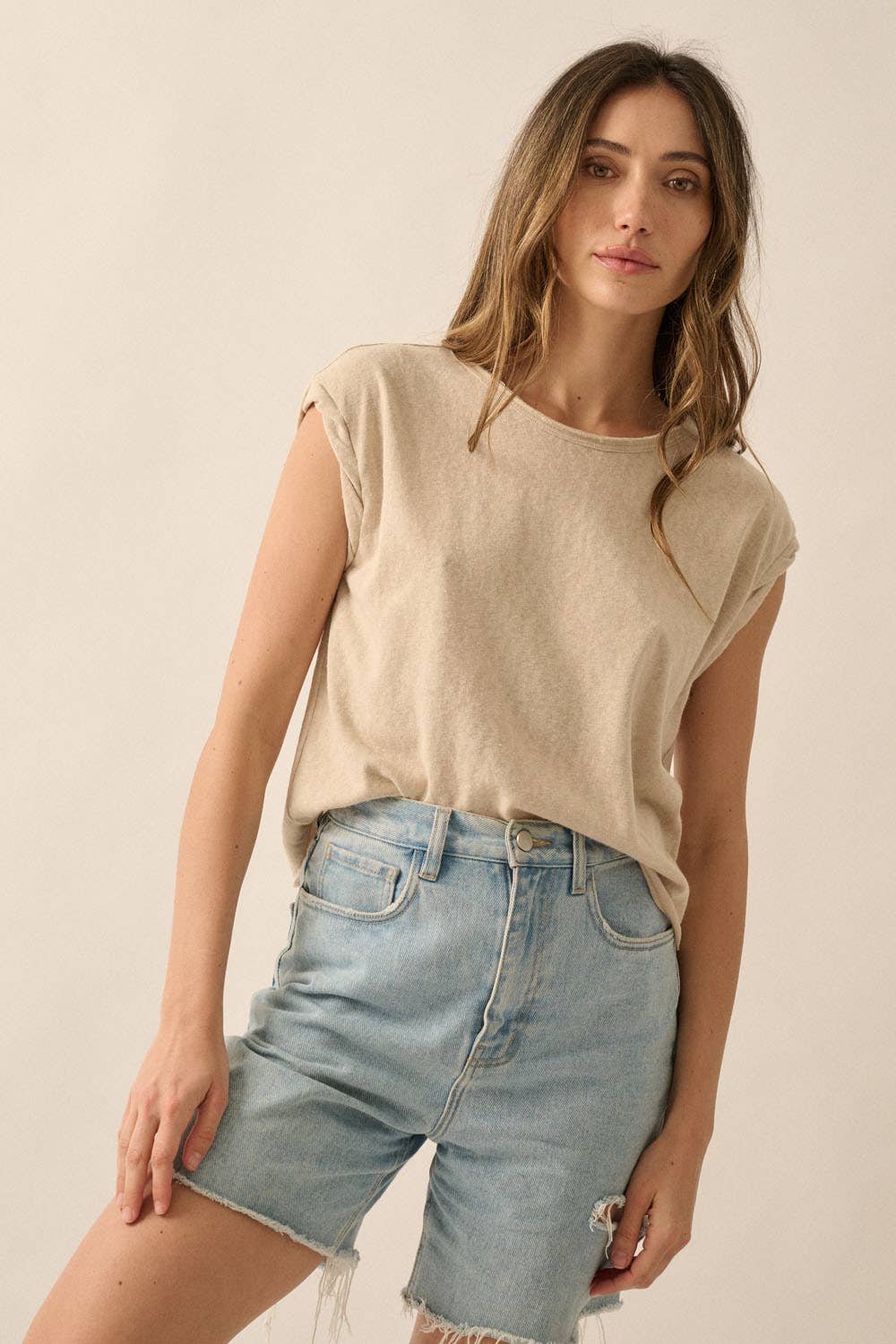 A mineral-wash slub knit t-shirt with a round neckline and a raw edge neckline. Relaxed fit, and super versatile.