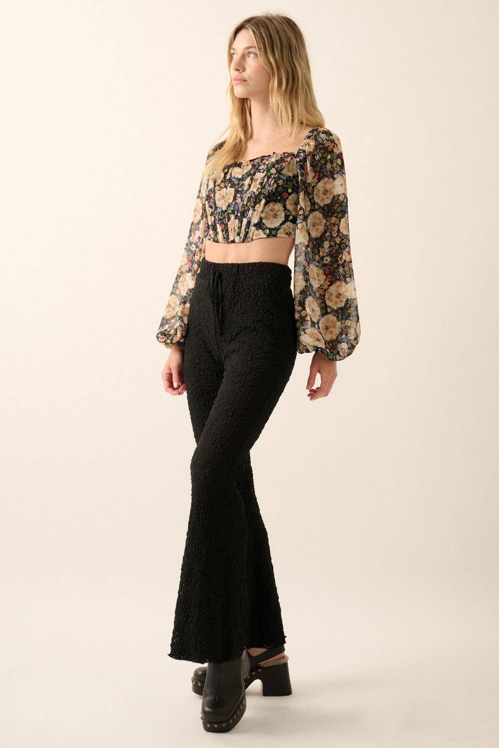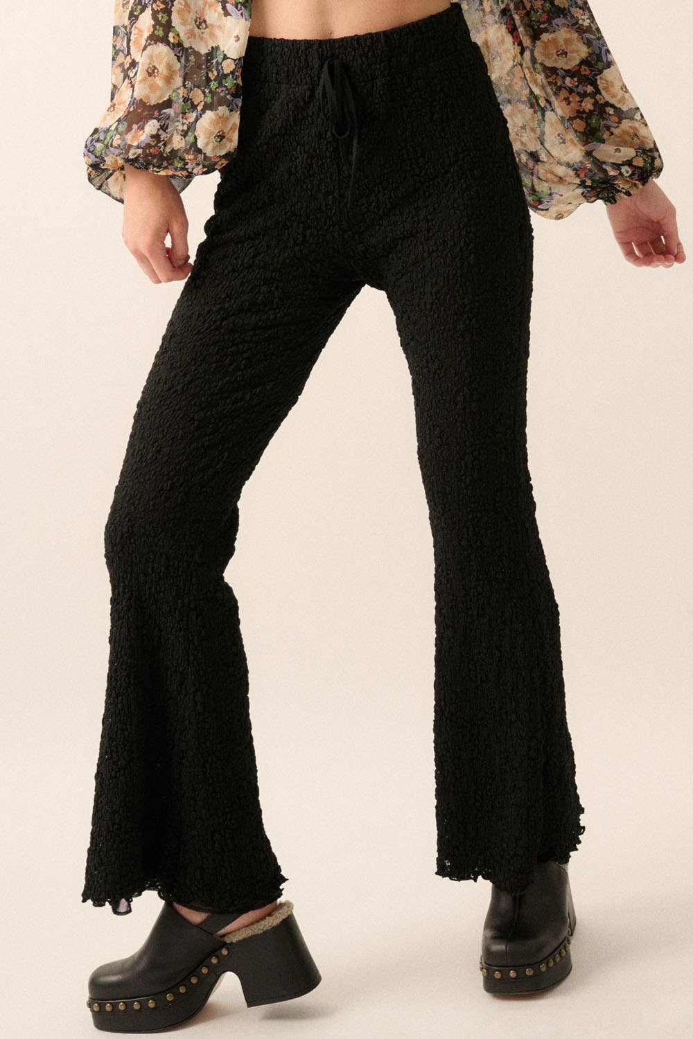 A pair of floral lace flare pants featuring an elastic waist with self-tie straps. Slightly see-through.