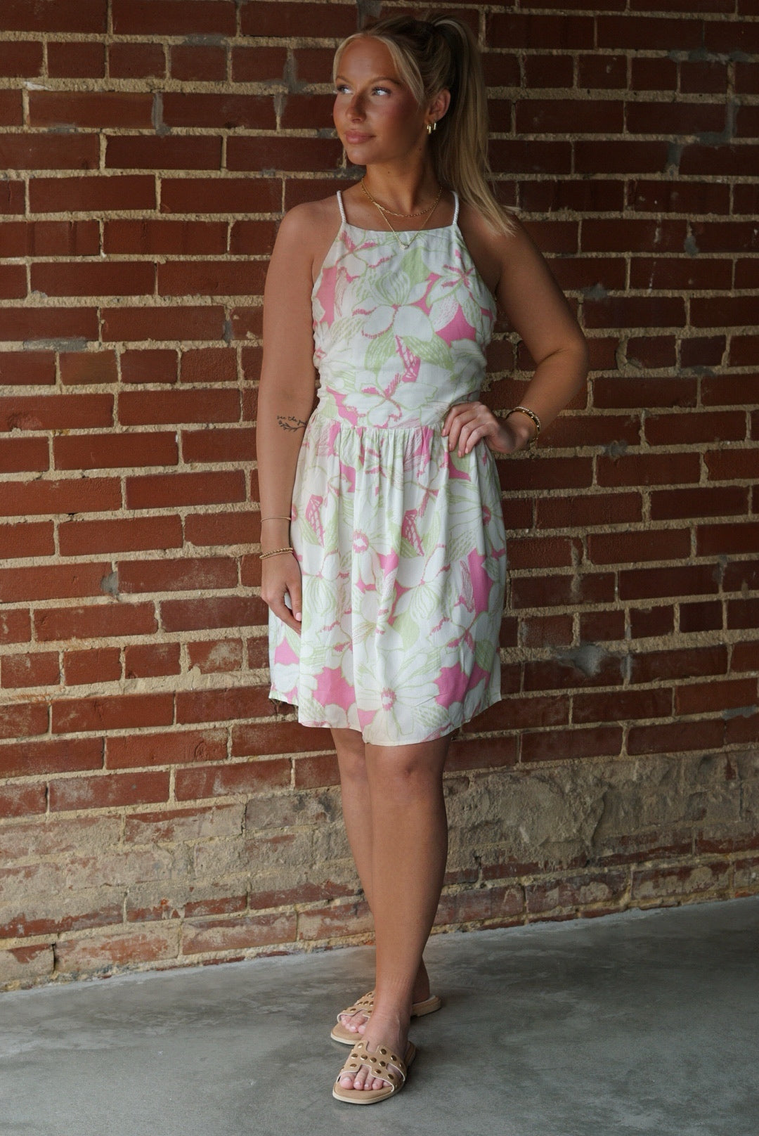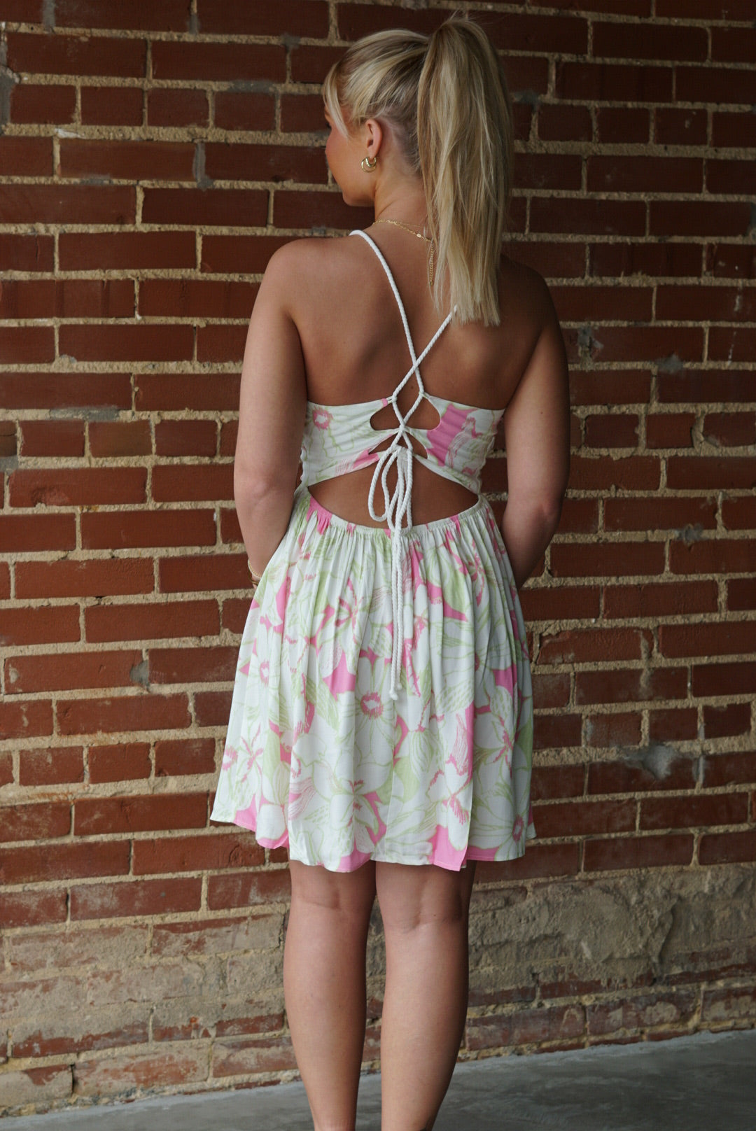 This gorgeous printed mini dress boasts a sleek neckline, sleeveless design, and a gathered skirt with an elastic waist for the perfect fit. The open back is adorned with a braided criss-cross tie closure, adding a touch of unique style. Its thigh-length and relaxed fit create a comfortable and effortlessly fashionable look.