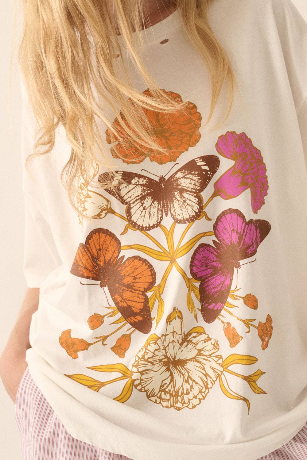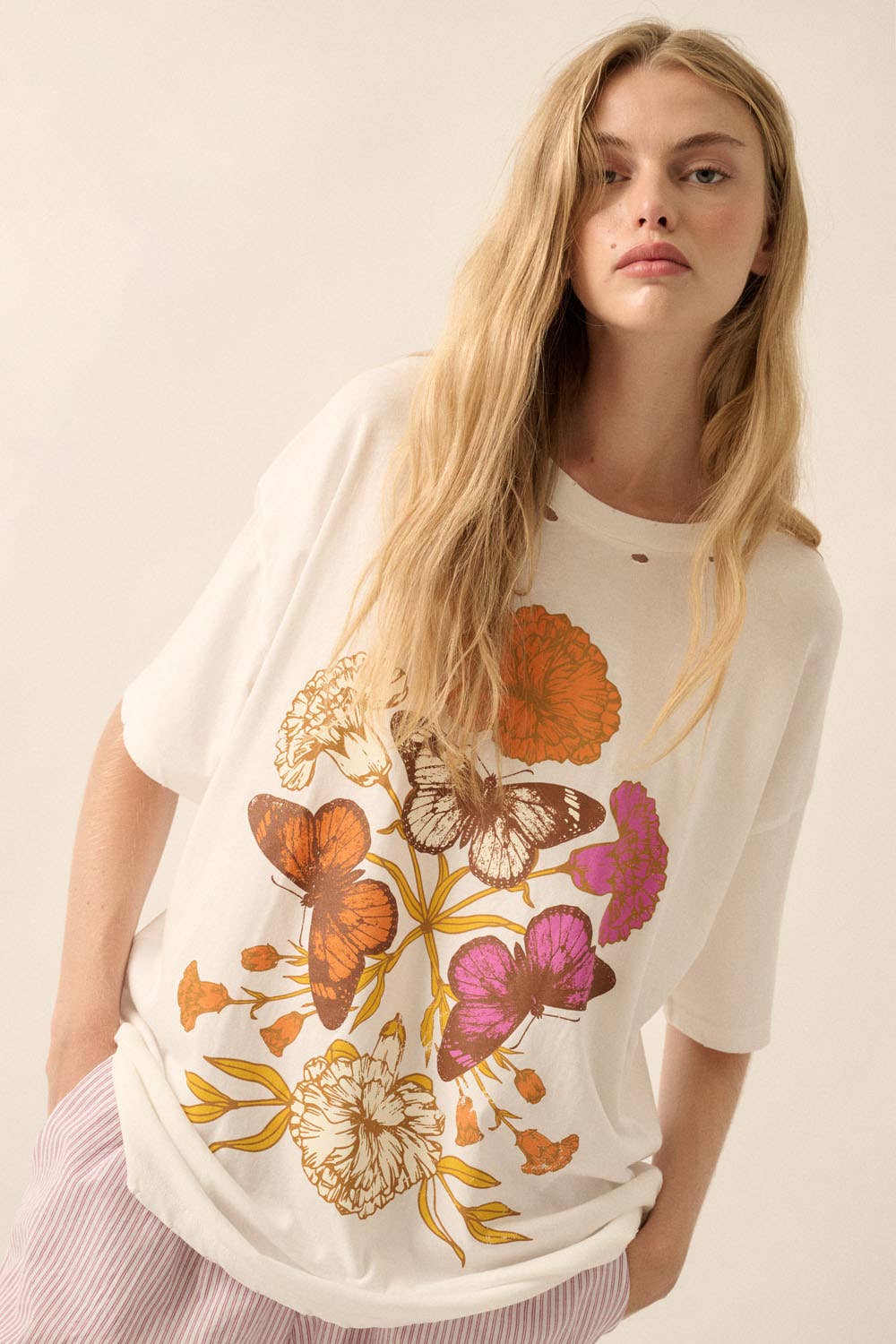Embrace a vintage feel with this oversized tee, adorned with stunning butterfly and flower graphics.