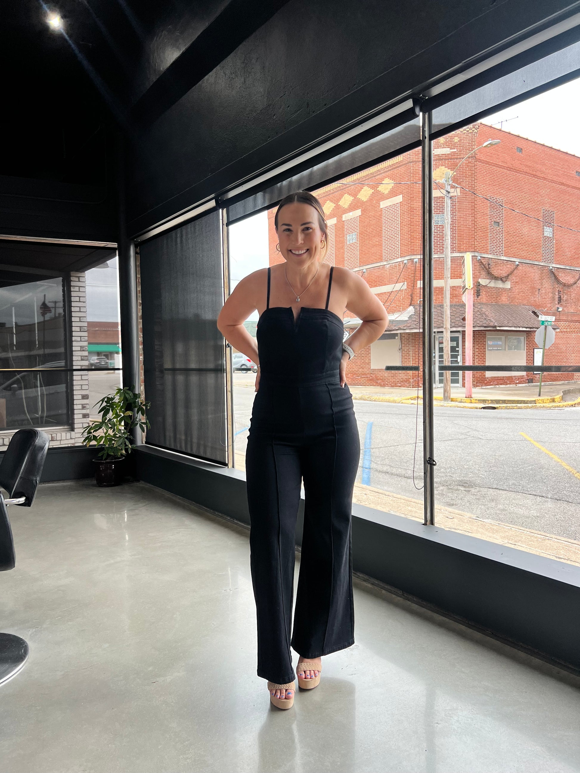 Chic denim jumpsuit for a sleek one-piece look that features, spaghetti straps, and a zippered back.