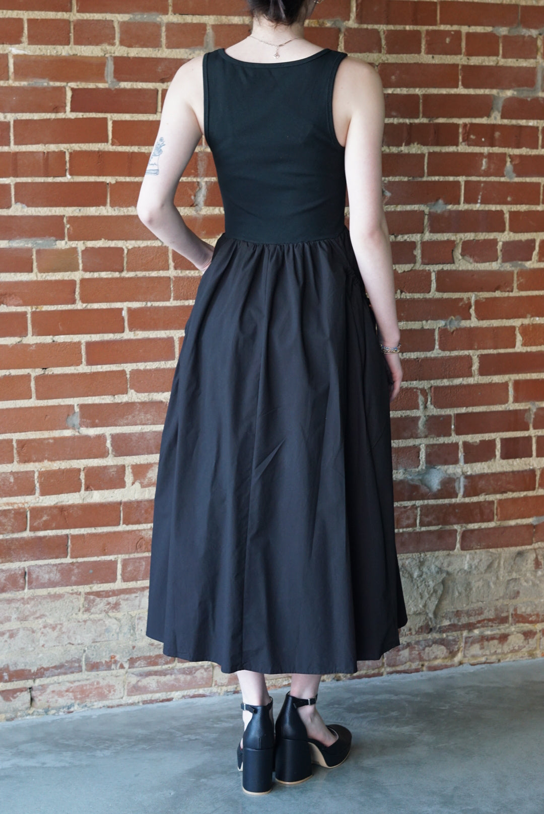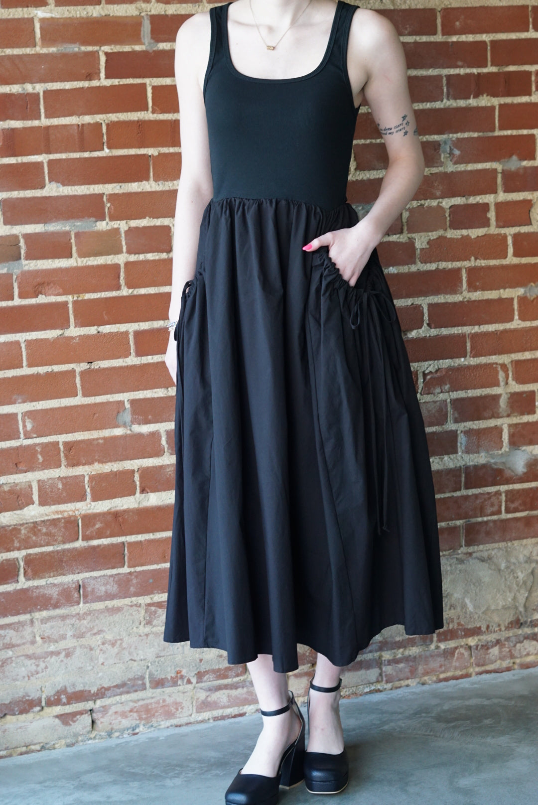 This dress is is flowy and has a scoop neck line; it features deep pockets that add to the design of the silhoutte.