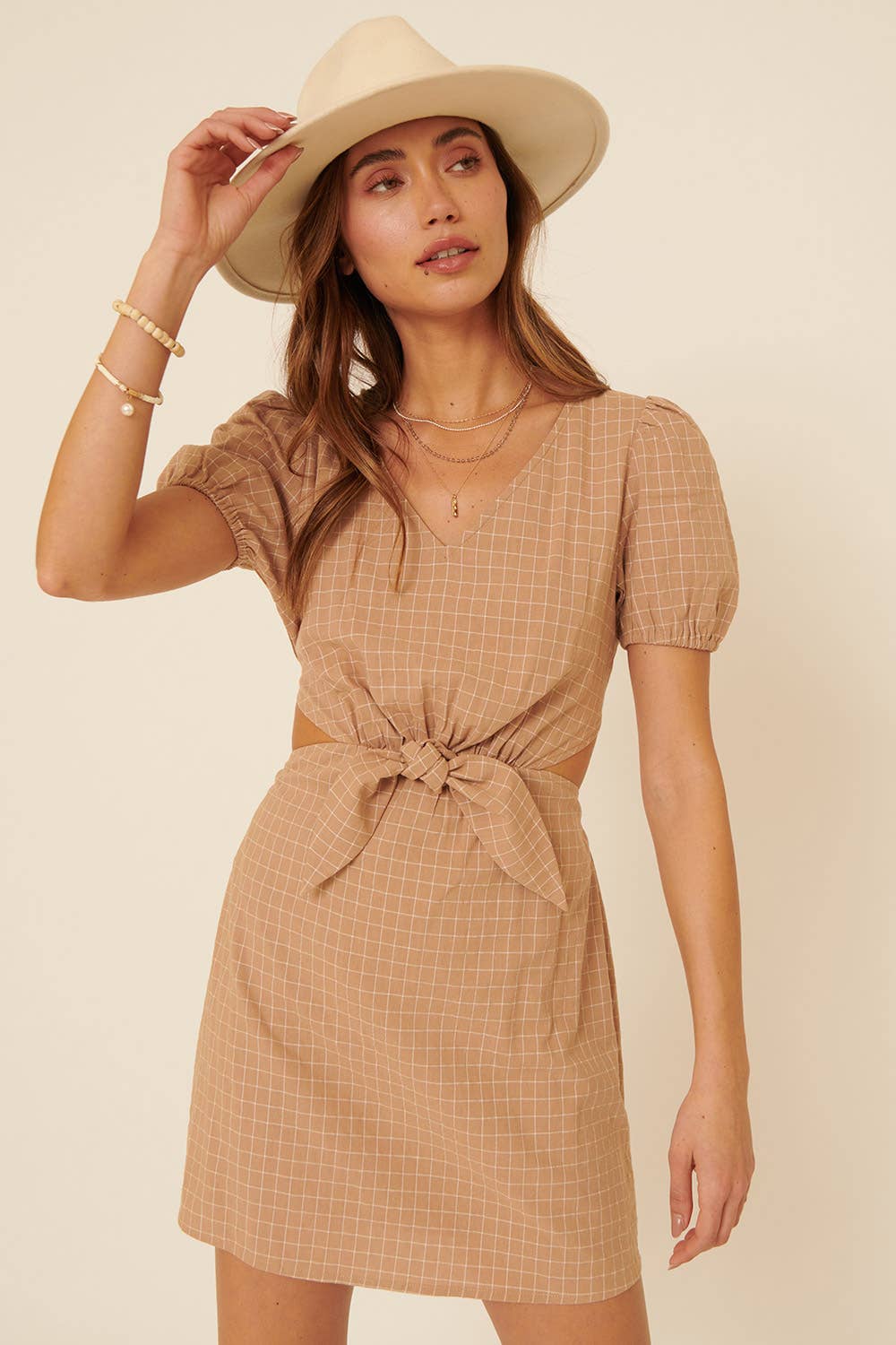 Crafted from a soft plaid fabric, this mini dress boasts a V-neckline, playful short puff sleeves, a charming front bow detail, and a flirty back cutout. Elastic cuffs and a cinched waist create a comfortable and flattering relaxed fit.