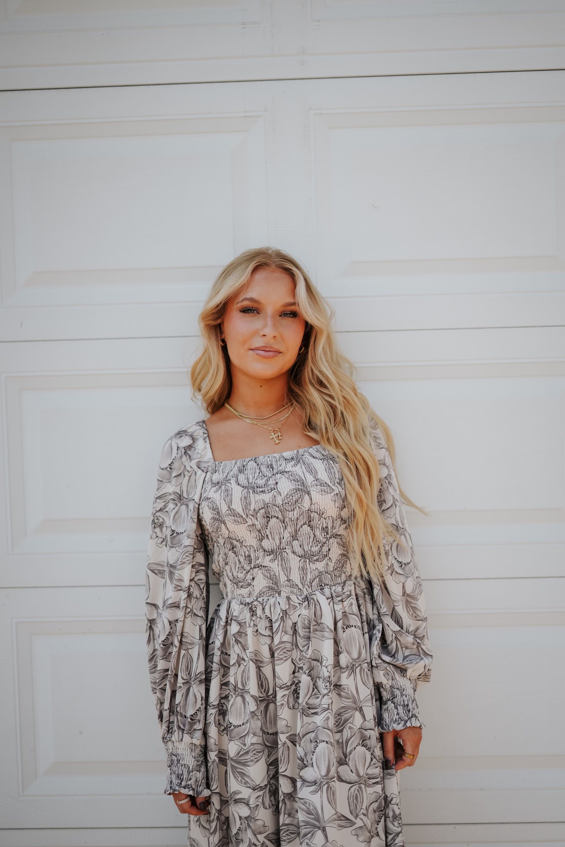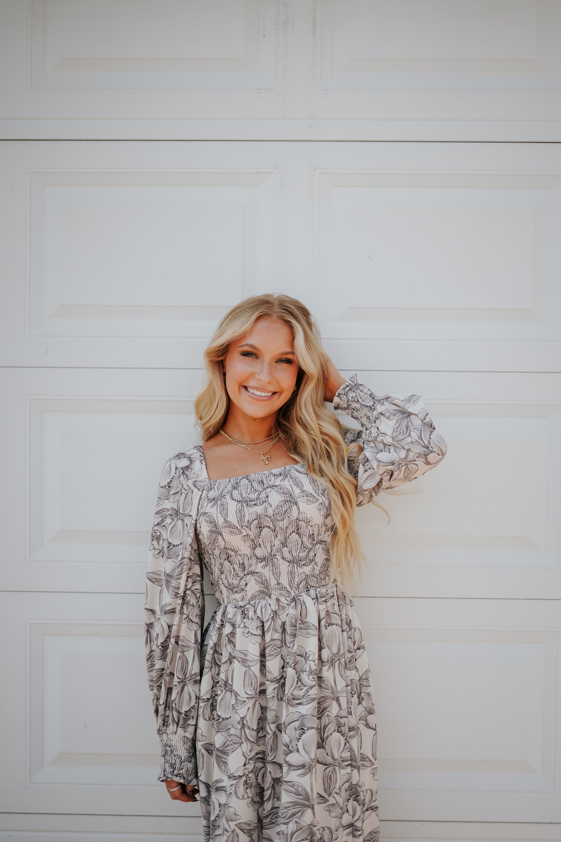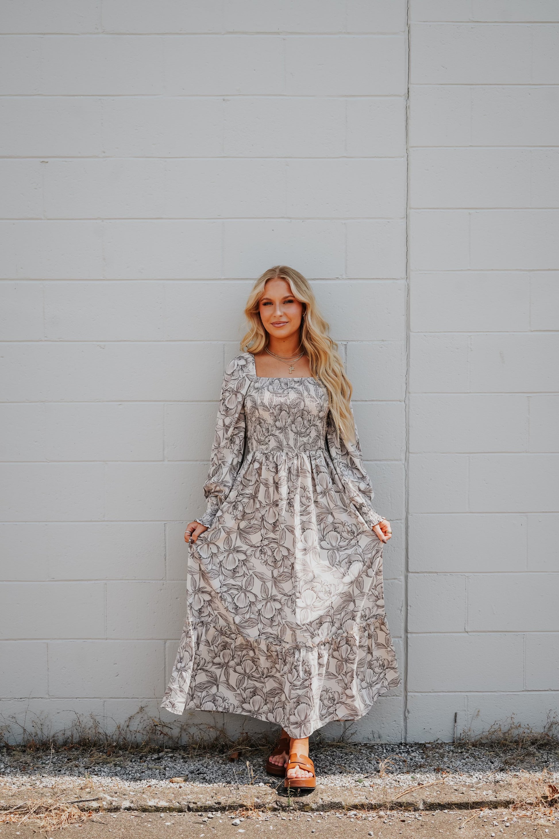 A floral print woven midi dress featuring a square neckline, long sleeves with smocked cuffs and a smocked bodice. Calf length, fit and flare.