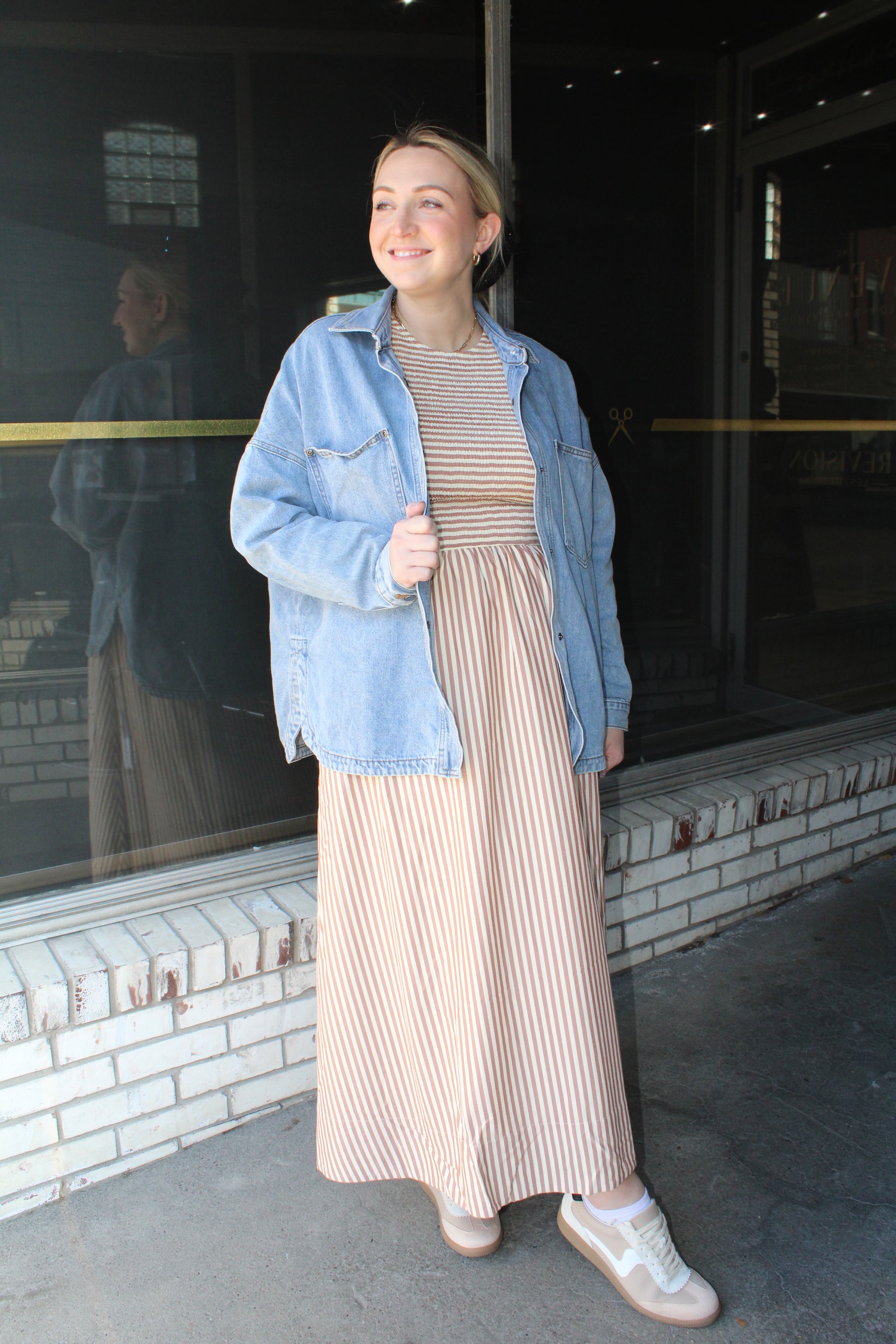 This brown striped dress combines trendy smocking details with cozy comfort. The relaxed fit and soft fabric make it an easy go-to piece for any occasion. Simple, stylish, and undeniably wearable.