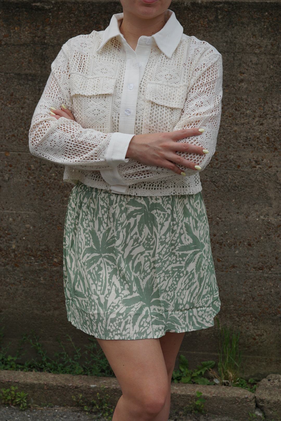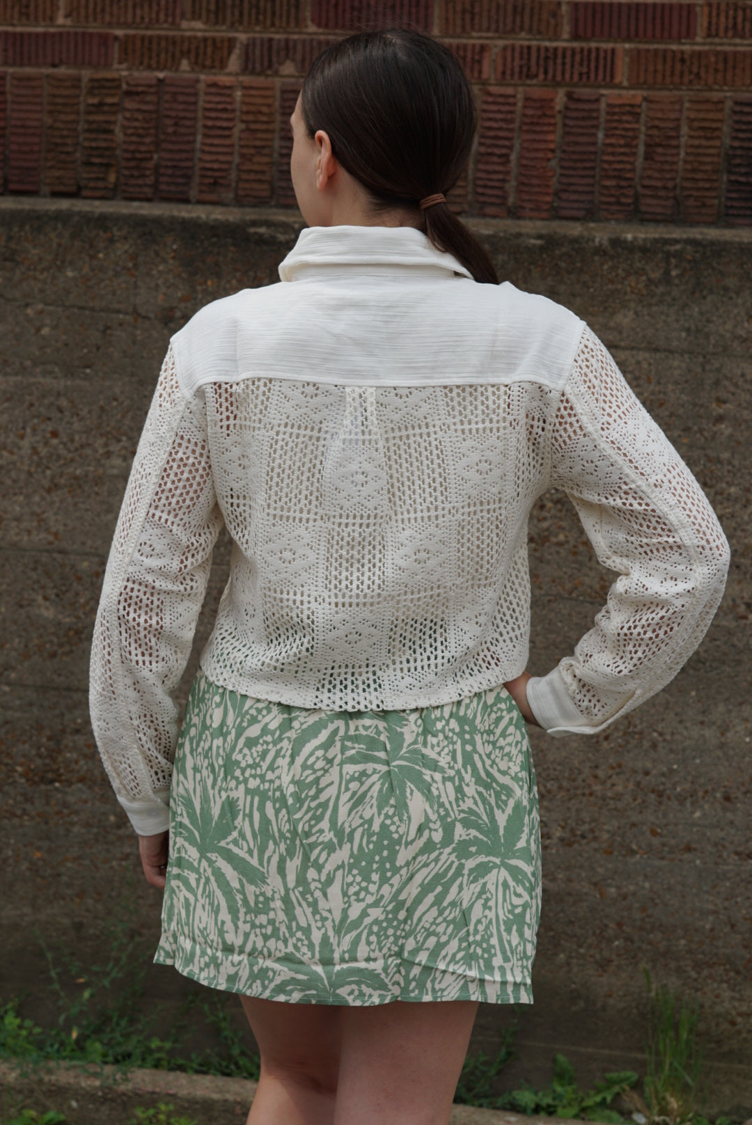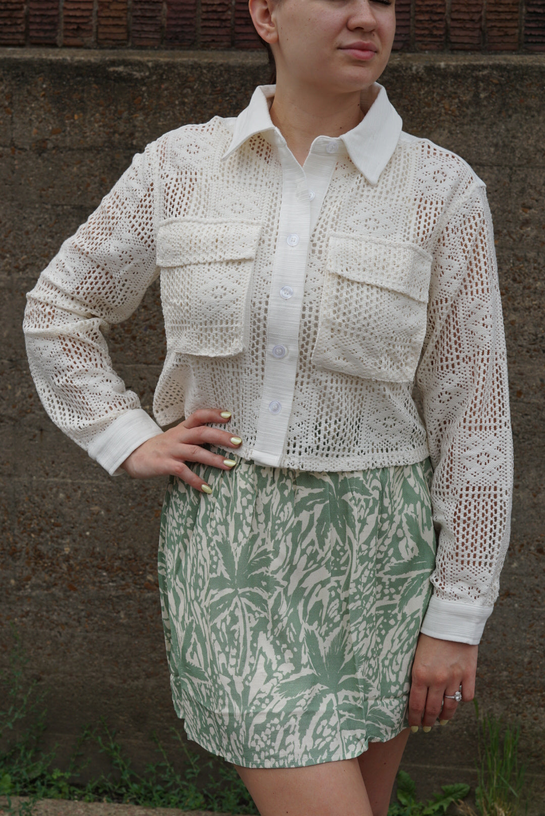 This is a lightweight, long-sleeve crochet button-up top in soft ivory. It features a collared neckline, two front pockets, and intricate lace detailing throughout. Perfect for layering!