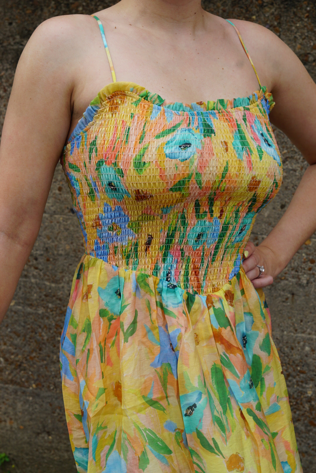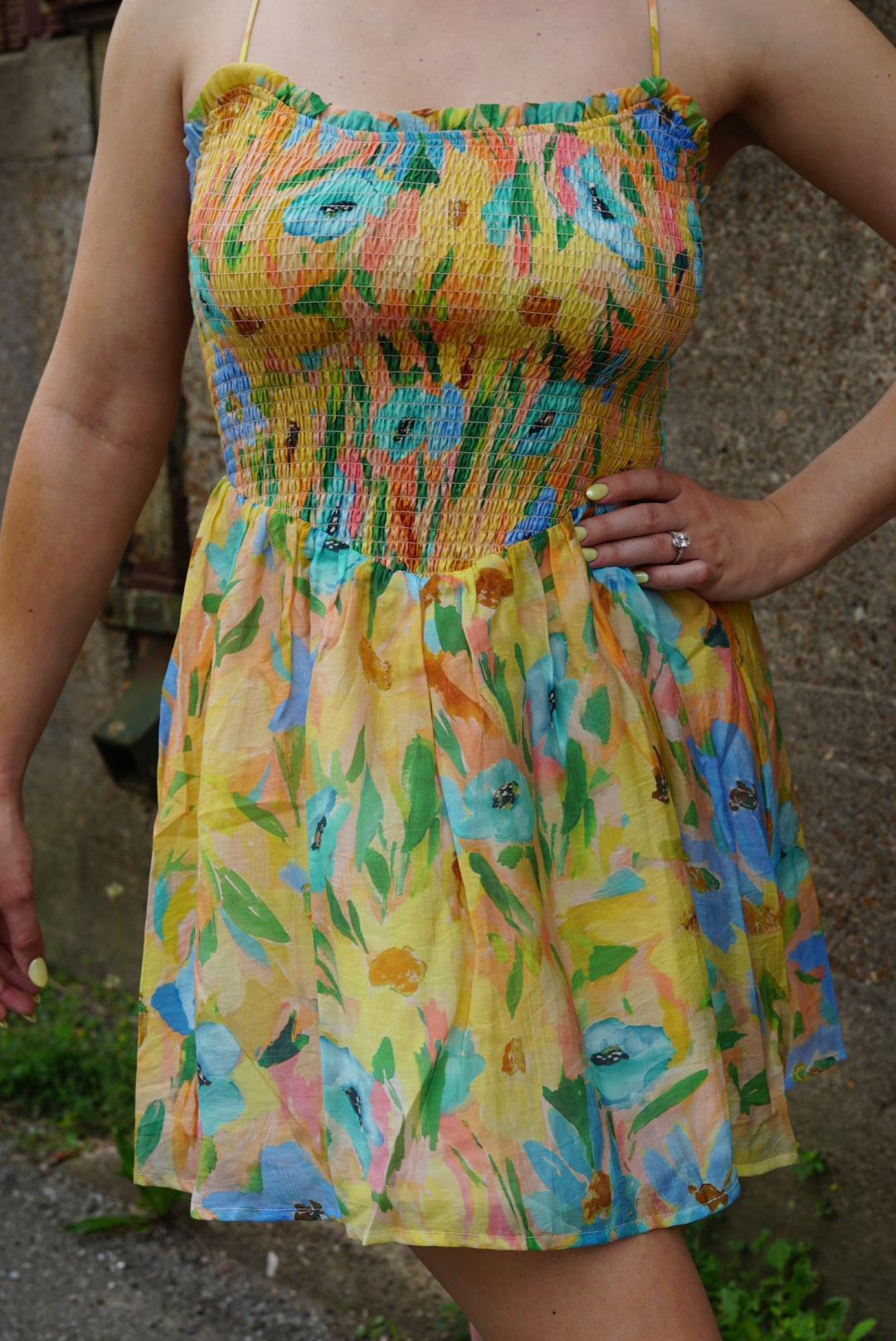 This dress features a stretchy smocked top and a flowy floral skirt. The soft, lightweight fabric and colorful watercolor print make it ideal for picnics, brunch, or a stroll in the sun. Comfortable, flattering, and effortlessly pretty.