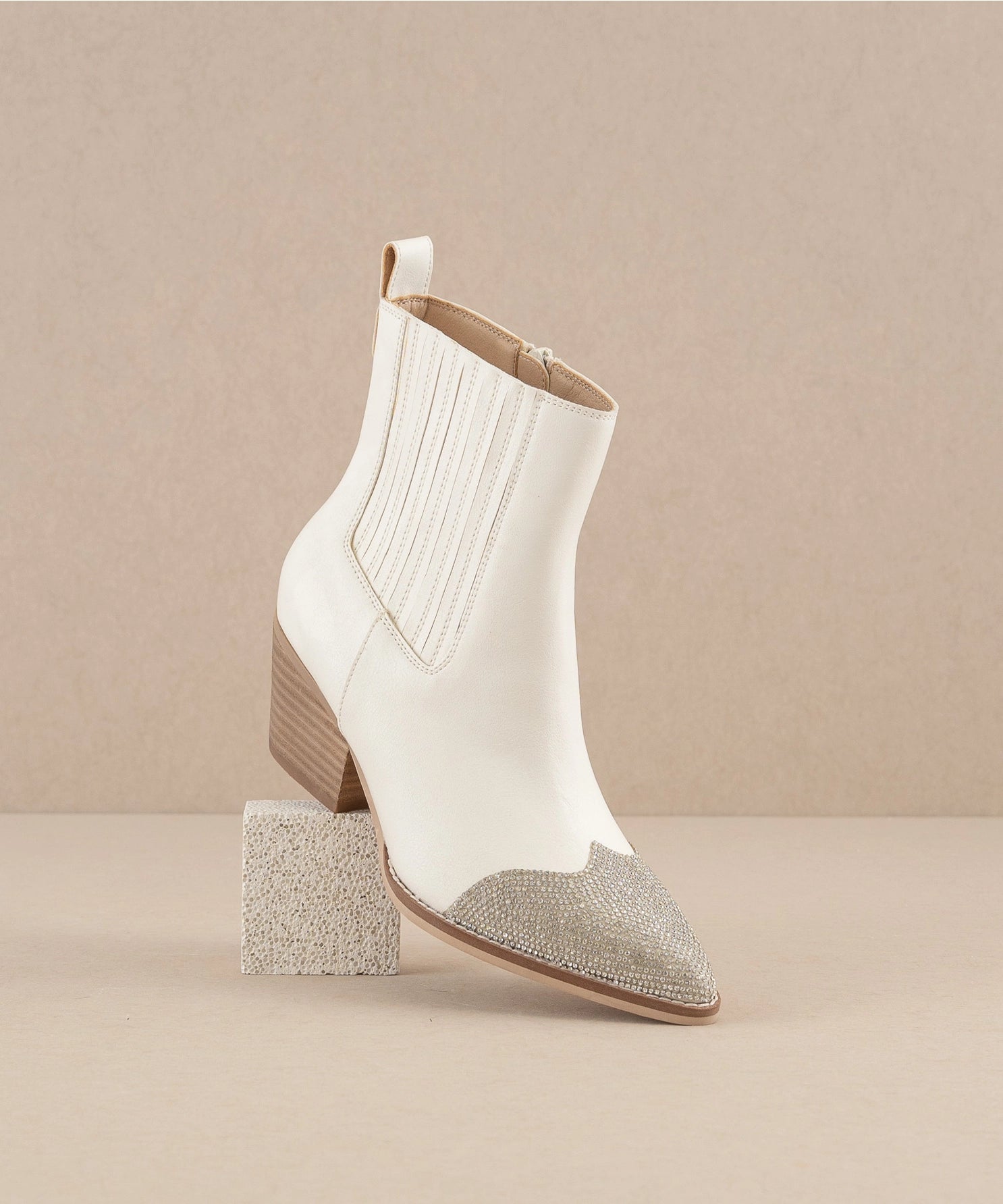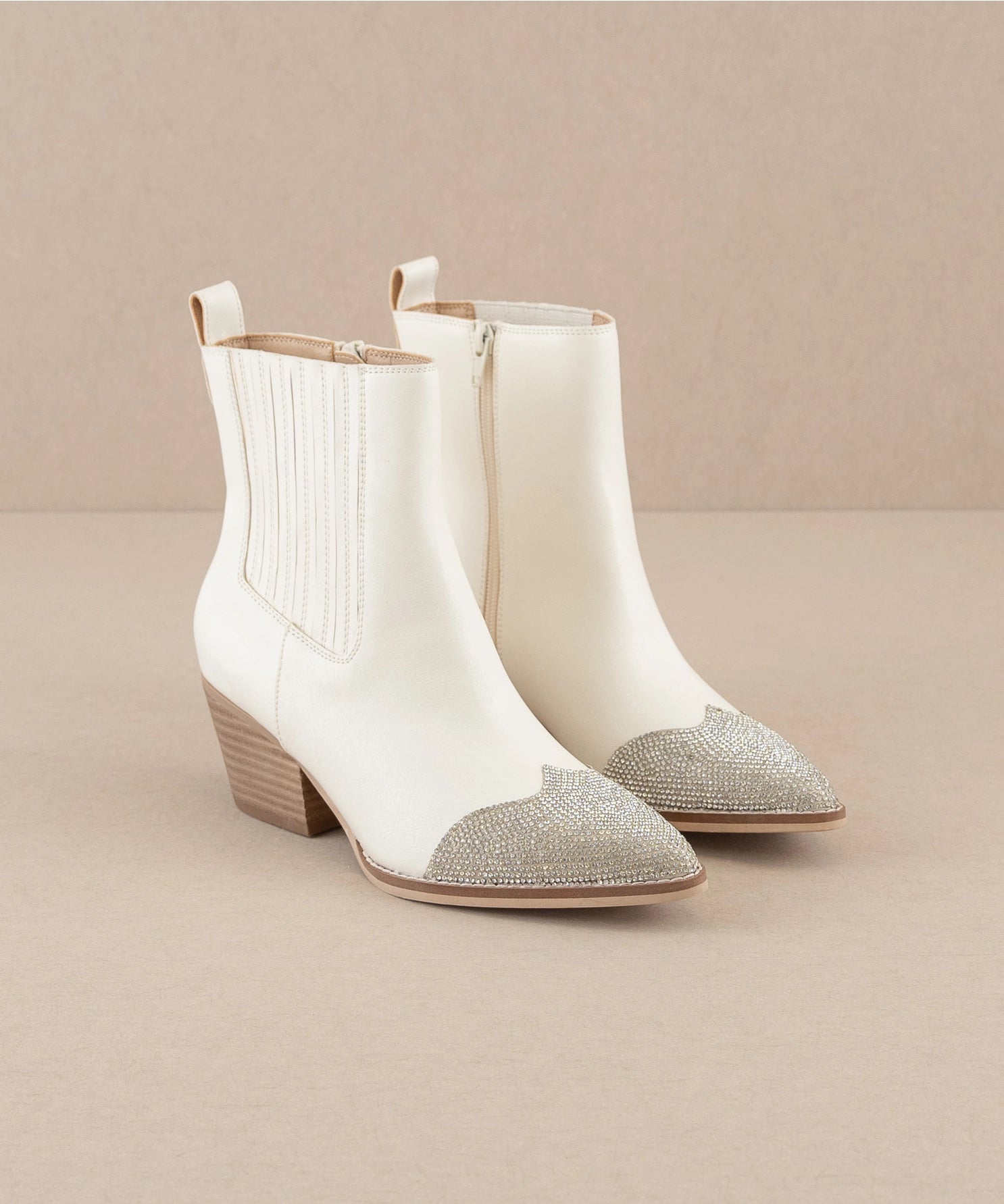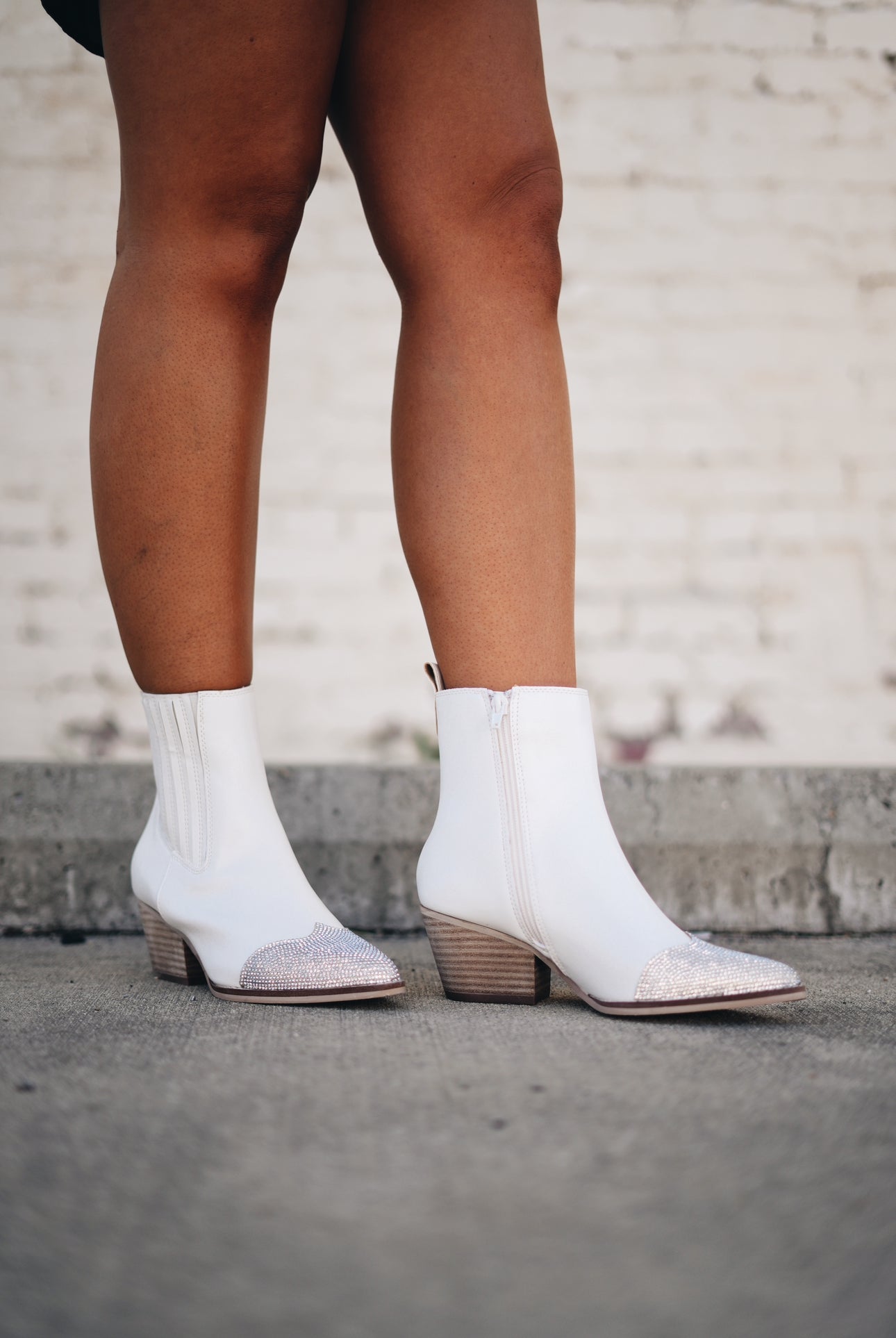 Turn heads with our Western Bootie adorned with a Rhinestone Toe. These chic booties blend classic western style with a touch of glamour, perfect for adding sparkle to any outfit.
