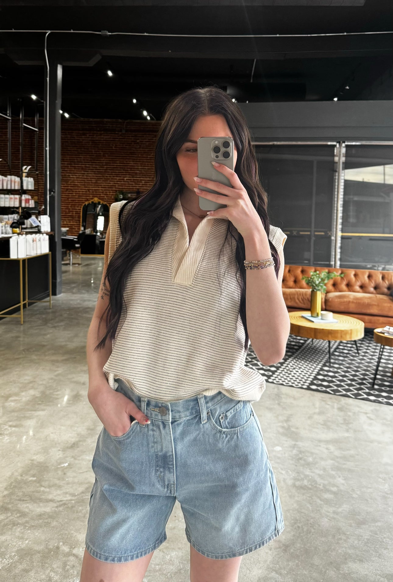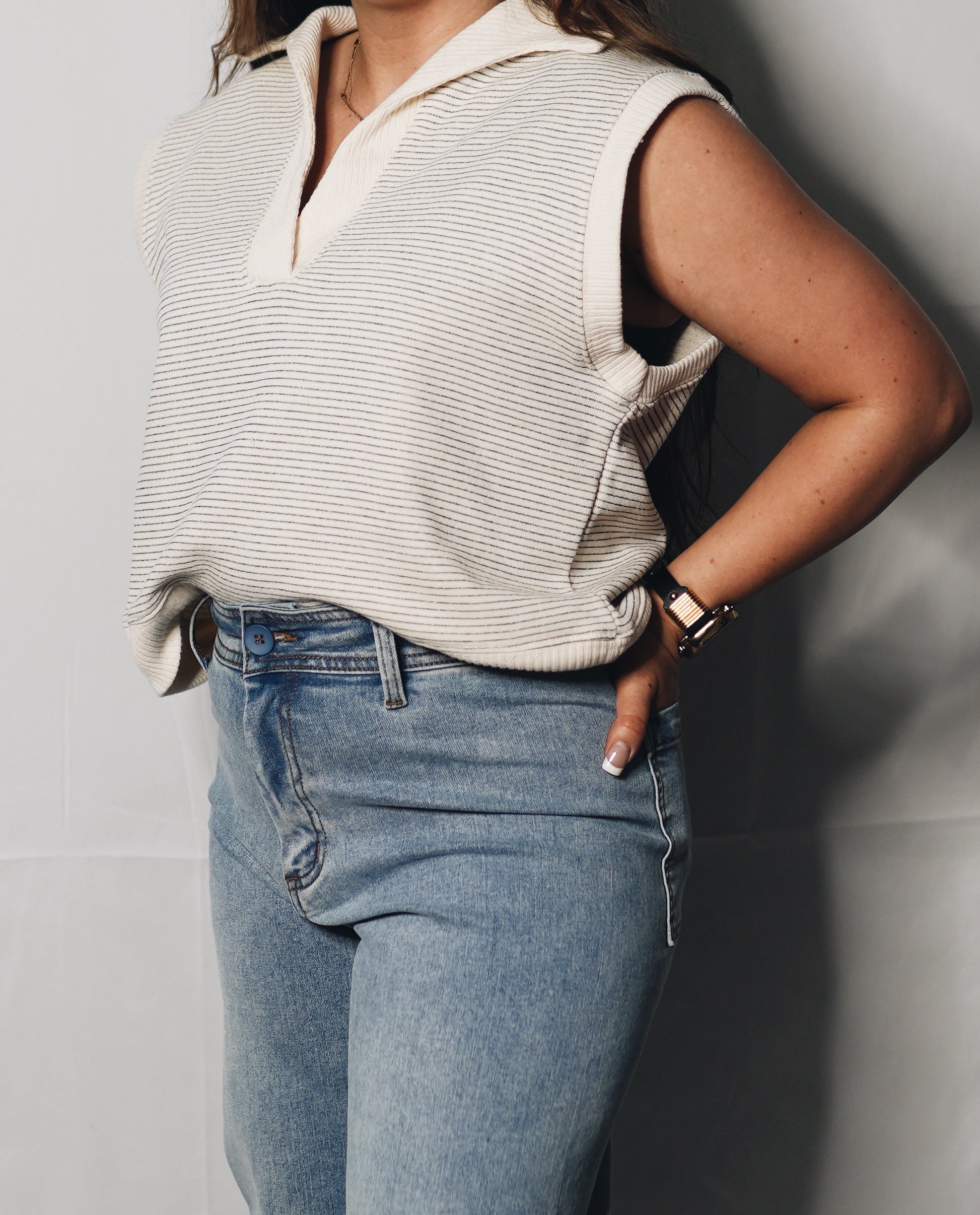 This super cozy sweater tank-top features a deep v neckline with a collar and it has a delicate stripe detail.