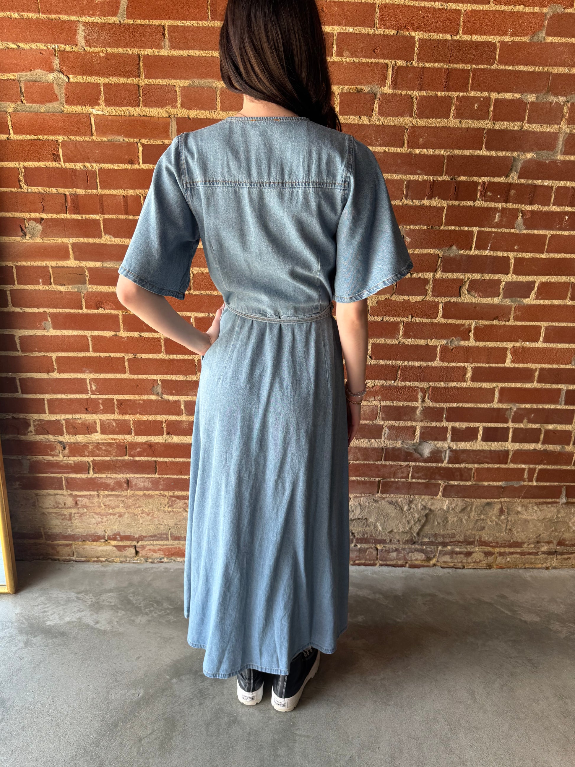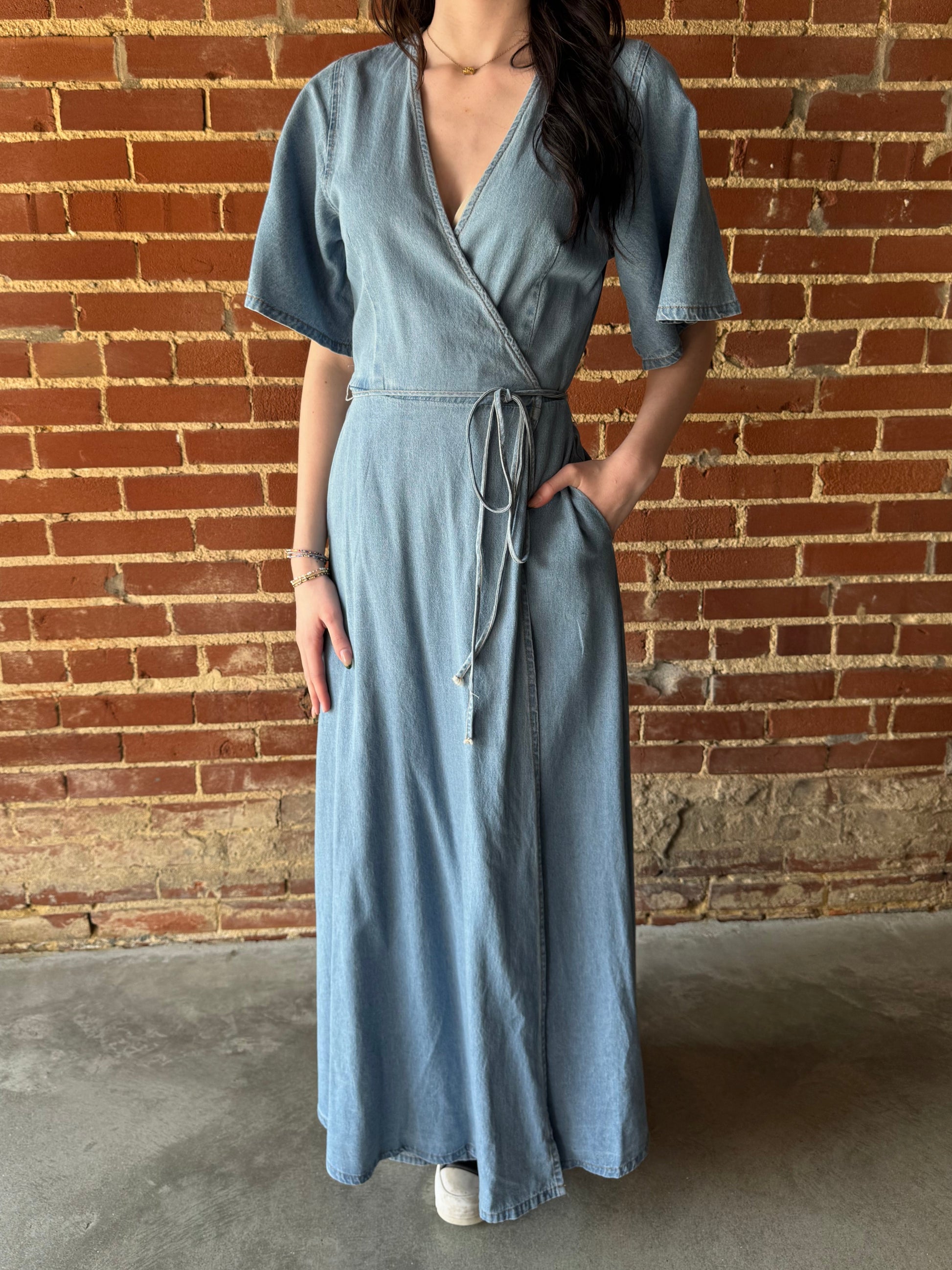 Made with soft and comfortable denim, this V-neck maxi dress is perfect for any occasion. The flowy design adds a touch of elegance while the wrap style cinches at the waist for a flattering look.